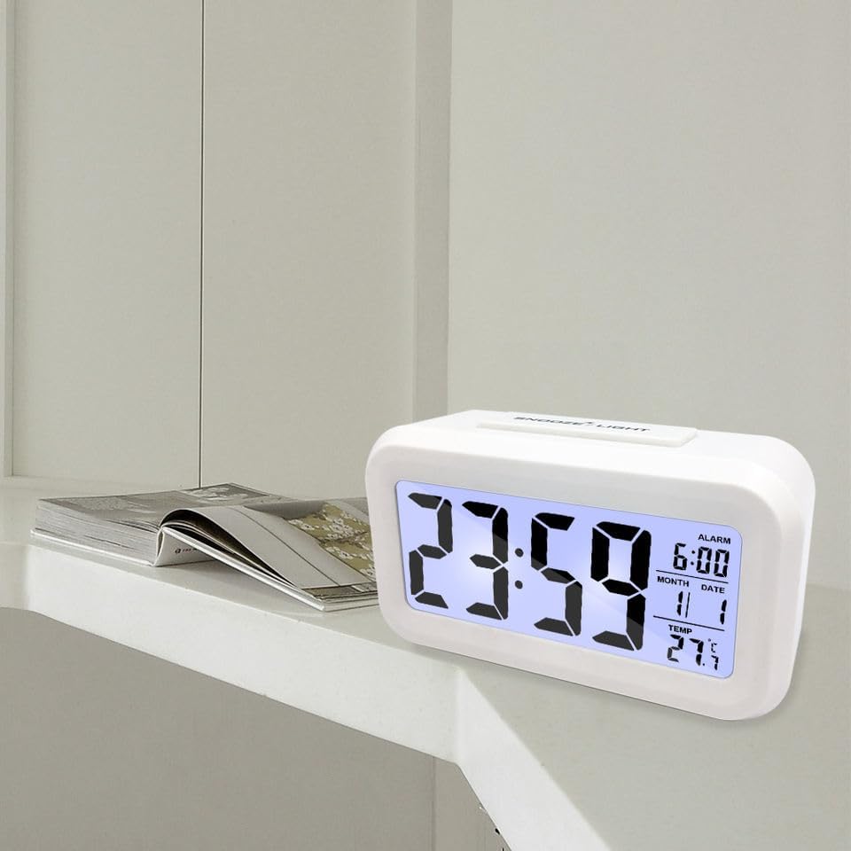 Le Prix Mokeum Réveil numérique pour Chambre à Coucher, Affichage LED, réveil numérique à Piles, réveil avec détection Intelligente de la température, répétition, pour Bureau, Table de Nuit, Voyage (Blanc)