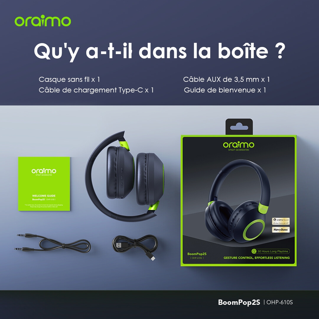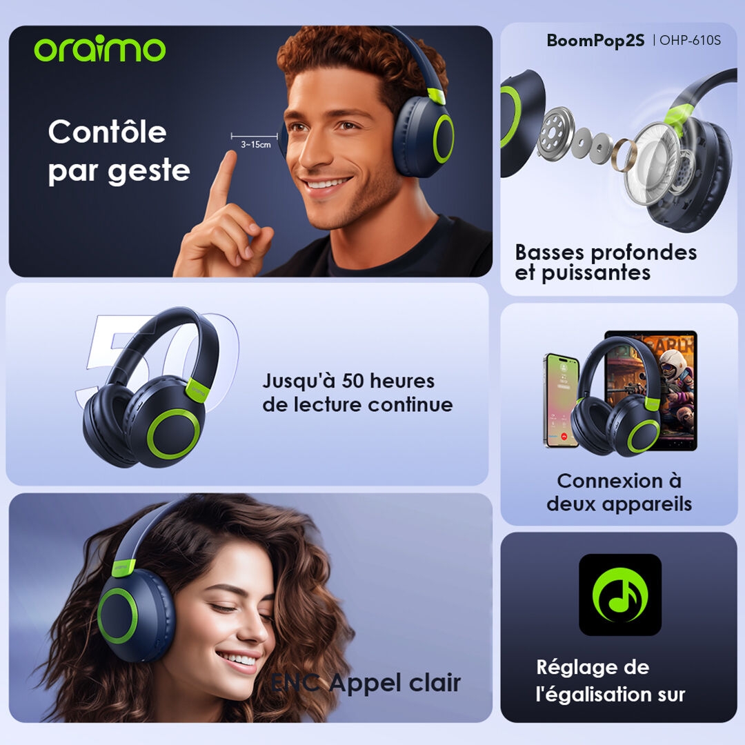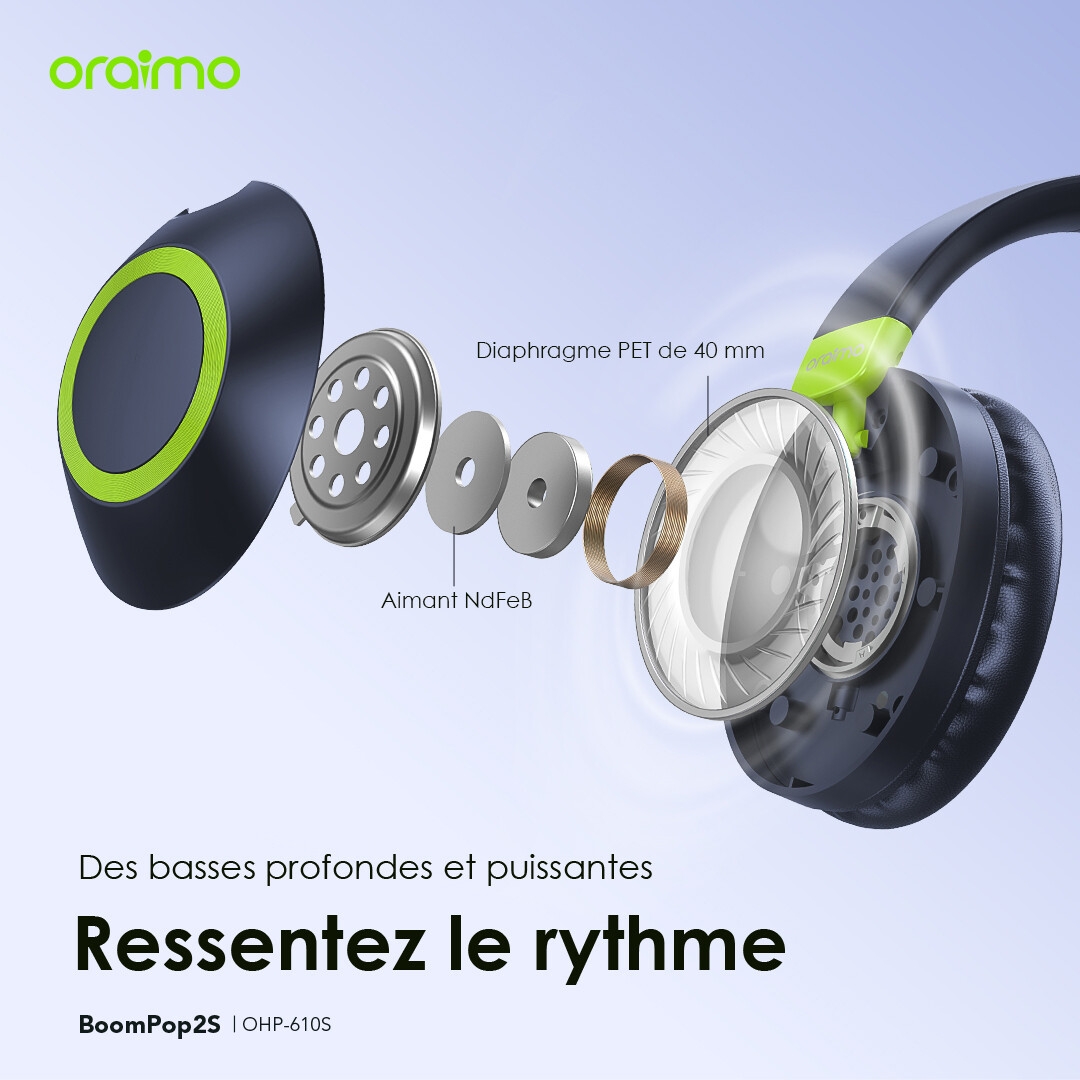 Fiche Technique Oraimo Casque Bluetooth BoomPop2S supra-auriculaires sans fil ENC Bluetooth 5.3 Grande Autonomie