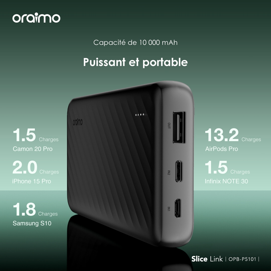 En résumé, le Oraimo Slice Link Banque d’alimentation 10000mAh 12W reste un outil indispensable dans notre vie quotidienne moderne, et avec un prix de 269.00 Dhs, vous pouvez obtenir un appareil performant et fiable.