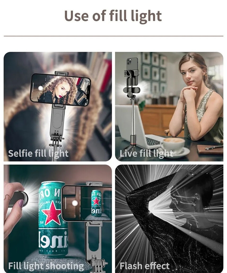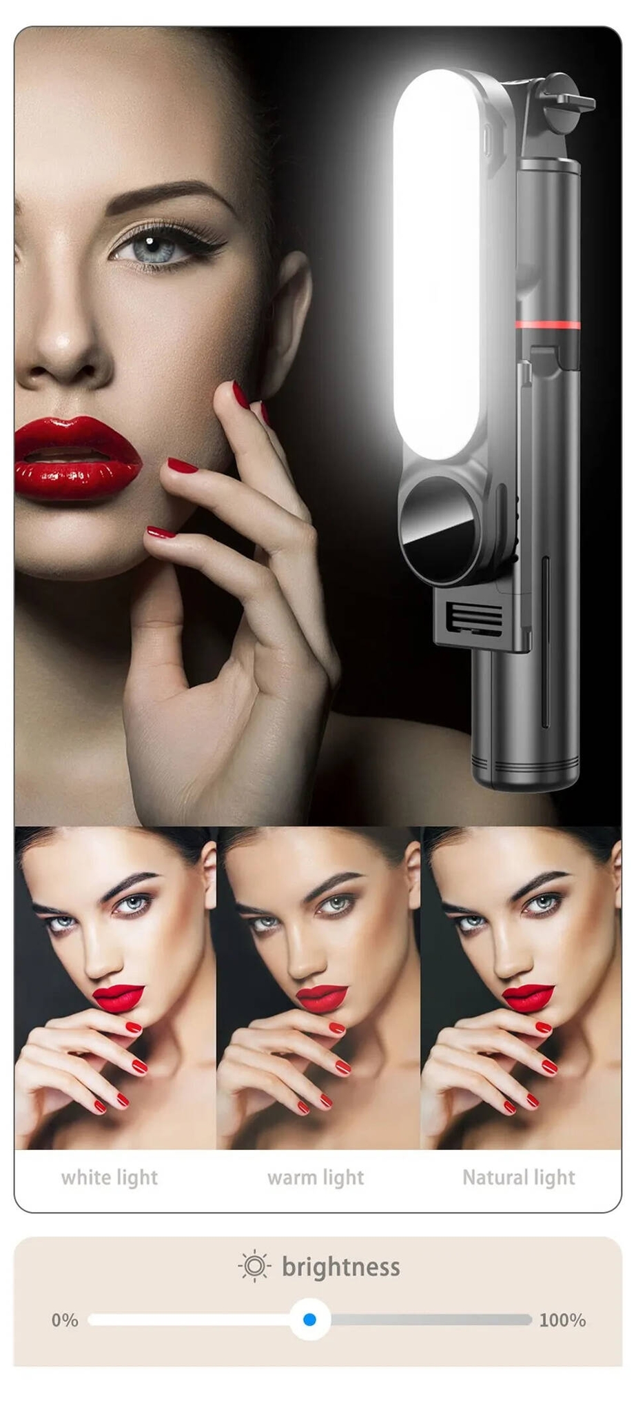 La L15 Portable Fill Light Selfie Stick est un accessoire 3-en-1 combinant perche extensible, trépied stable et double éclairage LED amovible. Idéale pour la photo, la vidéo et le live, elle offre un rendu lumineux et un contrôle à distance grâce à sa télécommande Bluetooth.