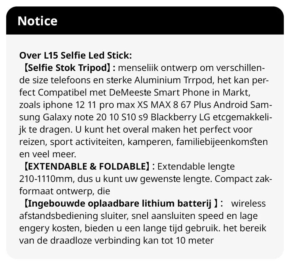 Fiche Technique Perche Selfie L15 avec Trépied et Double Éclairage LED Amovible – Télécommande Bluetooth Sans Fil – Extensible 1.1 mètre – Compatible Android & iOS