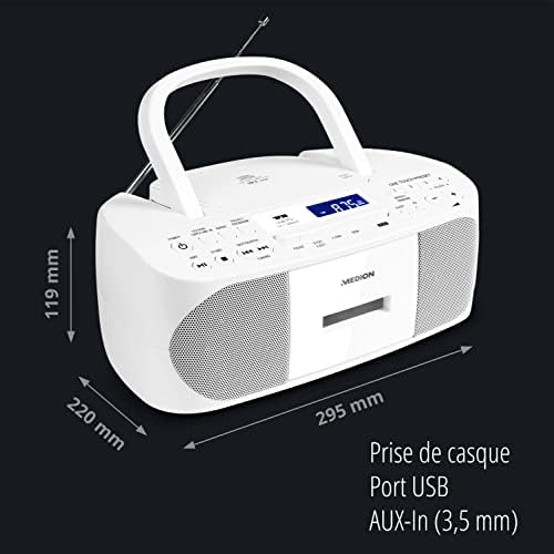 Voici le prix pour acheter Radio stéréo MEDION E65010 (Lecteur CD, Cassette, Connexion USB, entrée Audio AUX, Lecture MP3. Radio FM PLL, mémoire 40 Stations, Fonctionnement sur Batterie, télécommande) Blanc