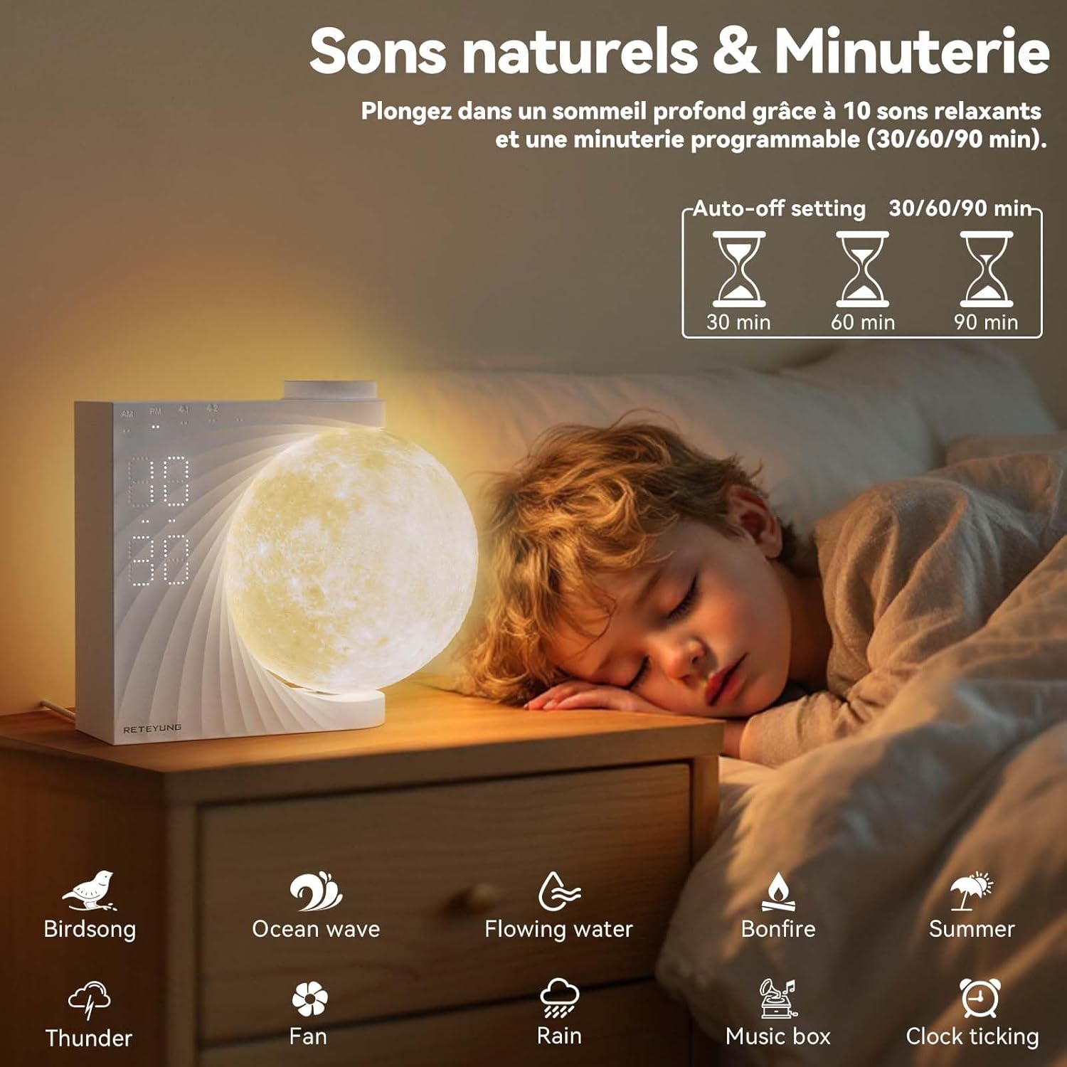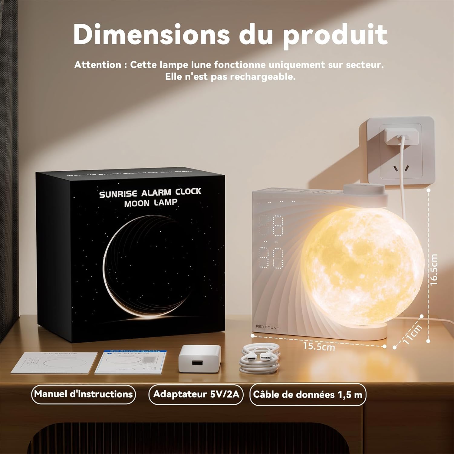 Fiche Technique RETEYUNG Moon Lamp with Alarm Clock Light, 2 Alarm Clocks, 8 Colors RGB Lunar Light, 10 Natural Sound, Night Light 3 Levels of Brightness Bedside Lamp for Women/Girls/Boys. au Maroc
