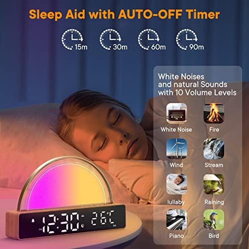 Avis sur Réveil Lumineux, Lampe de Réveil avec Simulation de Lever du Soleil, Snooze/6 Sonneries/10 Sons de Sommeil/Minuterie/Affichage Température, Lampe Atmosphère avec 7 Couleurs Changeantes, Port de Charge