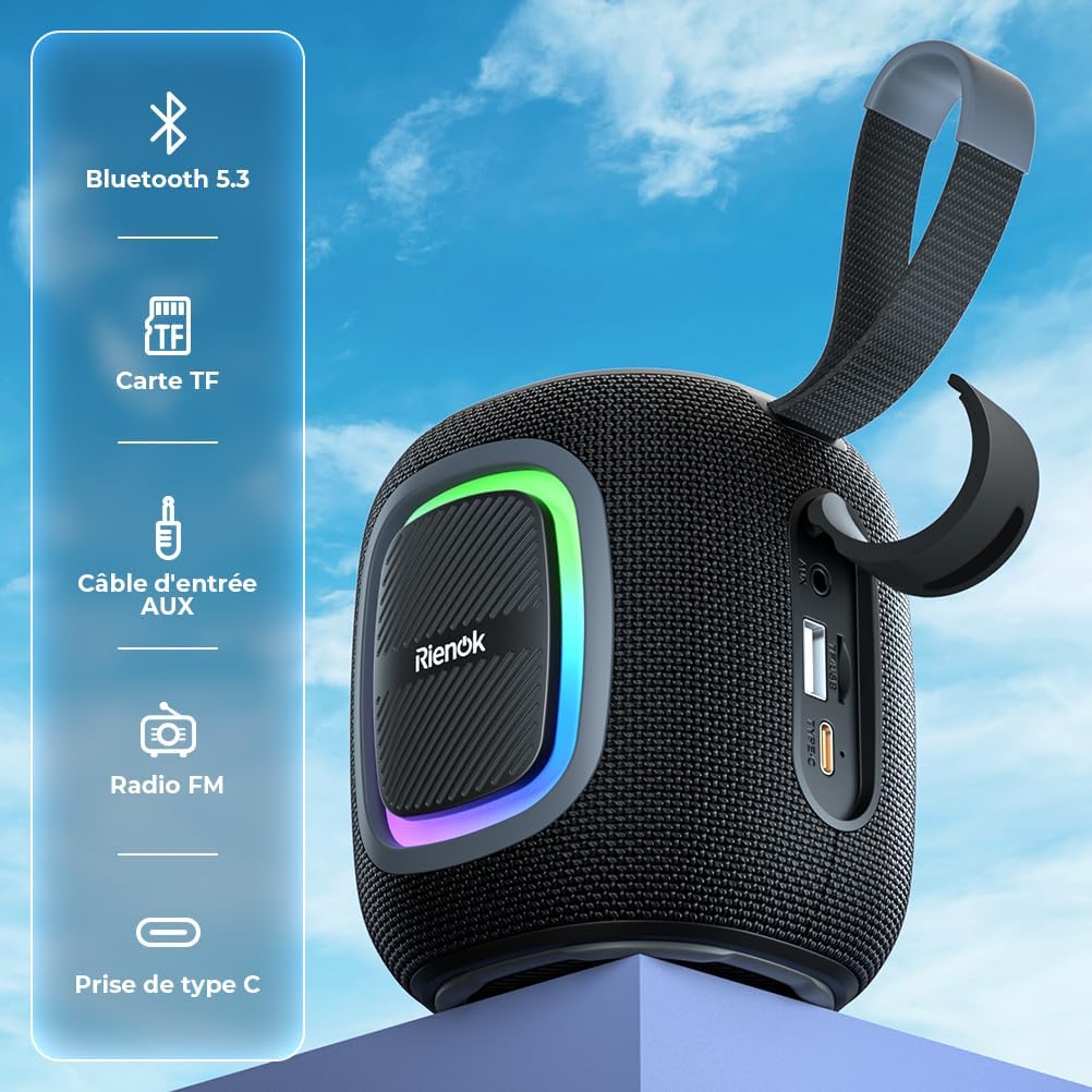 Fiche Technique RIENOK Portable Bluetooth Speaker, Powerful Luminous Speaker with Bluetooth 5.3, Battery Life 15H, 1800mAh, FM Radio, USB Flash Drive, AUX Port, TF Card, for Beach Parties, Hiking, Travel, Black au Maroc