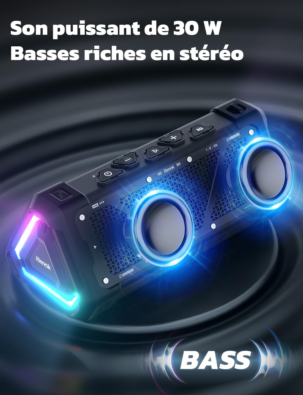 Voici le prix pour acheter RIENOK S11 Portable Bluetooth Speaker with Reinforced Bass, 3 Equalizer Modes, USB Audio Mode, Bluetooth 5.3, 30W Powerful Speaker, IPX7, TF Card, Beach Parties, Hiking, Travel, Black au Maroc
