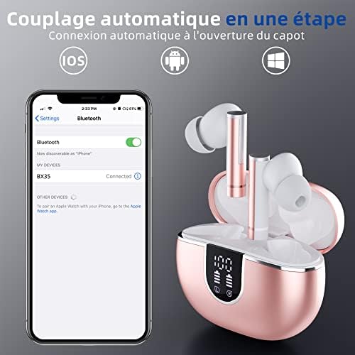 Double Affichage Numérique à LED: oreillette bluetooth sans fil offrent 7 heures de musique et de temps de conversation avec un seul chargement complet. Le boîtier de charge inclus peut recharger l’écouteur jusqu’à 5 fois. Le double affichage numérique LED indépendant du boîtier de charge vous permet d’afficher le pourcentage de batterie restant et son état à tout moment..Avec technologie type-c, le boîtier de charge termine son chargement complet uniquement une heure.
