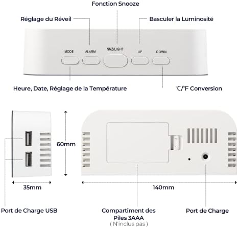 Fiche Technique Vinabo Réveil Numérique Miroir, LED Miroir Horlogue Digitale Réveil de Chevet Réveil Matin, 2 Niveaux de Luminosité,12/24H, avec 2 Ports De Charge USB, Décoration Moderne pour la Maison ou la Chambre