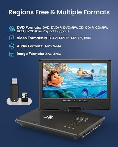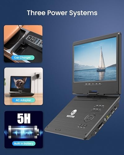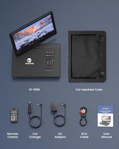 Le Prix WONNIE Lecteur DVD portable 12,5″ avec écran HD pivotant de 10,5″, avec étui pour appuie-tête de voiture, batterie rechargeable intégrée de 5 heures, chargeur de voiture et adaptateur secteur, prend en charge USB/carte SD/Sync TV, régions gratuites