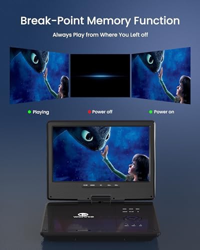 🔊【𝐏𝐨𝐰𝐞𝐫𝐟𝐮𝐥 & 𝐋𝐨𝐮𝐝𝐞𝐫 𝐒𝐩𝐞𝐚𝐤𝐞𝐫𝐬 & 𝐋𝐚𝐬𝐭 𝐌𝐞 𝐦𝐨𝐫𝐲】 Le lecteur DVD portable WONNIE est spécialement conçu avec des haut-parleurs à double puissance améliorés, qui rend le son plus fort et plus clair. Le lecteur DVD portable pour enfants dispose également d’une prise pour écouteurs 3,5 mm que vous pouvez brancher sur un casque pour vous immerger dans le festin audio. La fonction de mémoire de point d’arrêt permet au lecteur DVD portable avec écran de reprendre chaque scène passionnante d’où vous l’avez laissé la dernière fois.