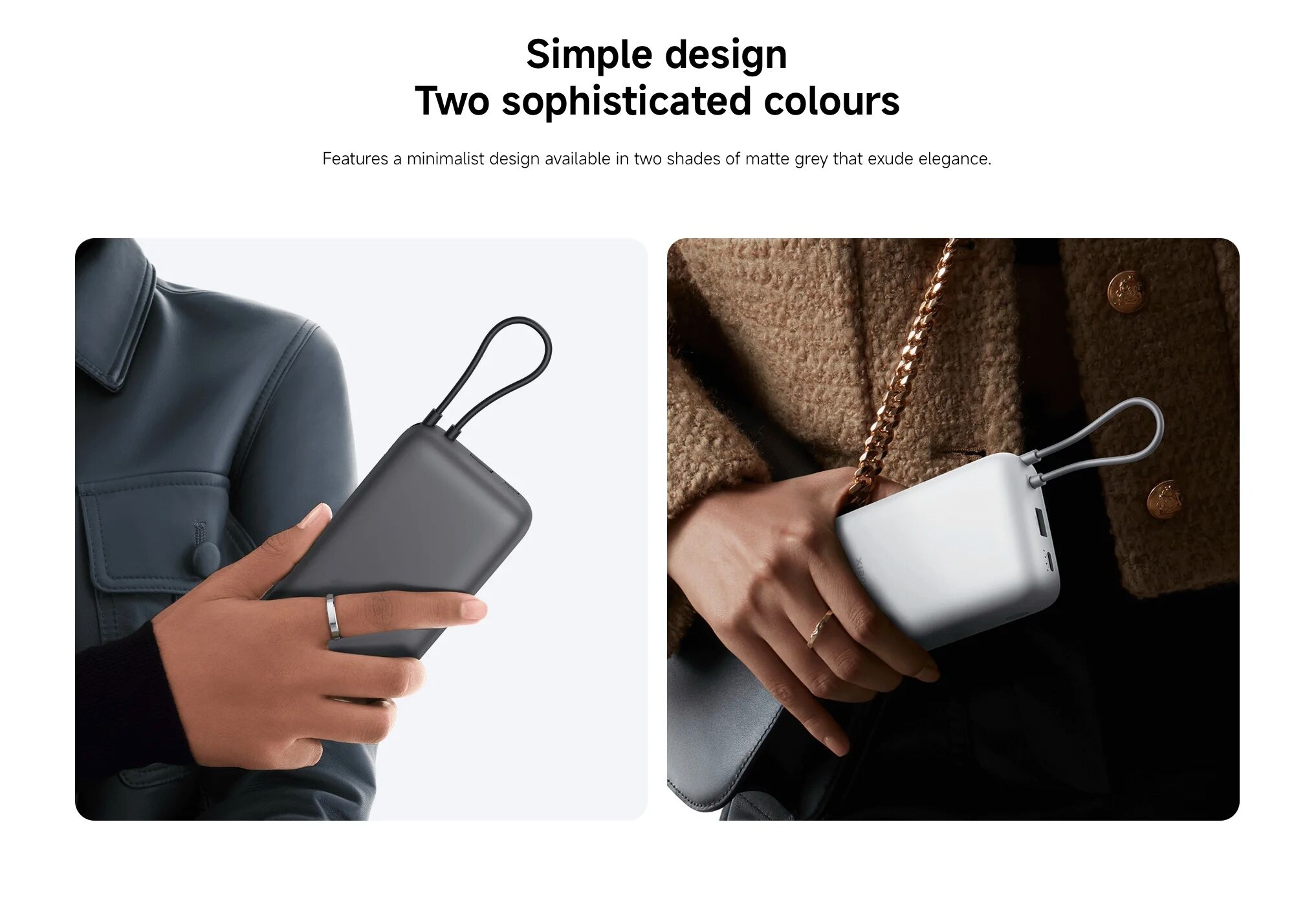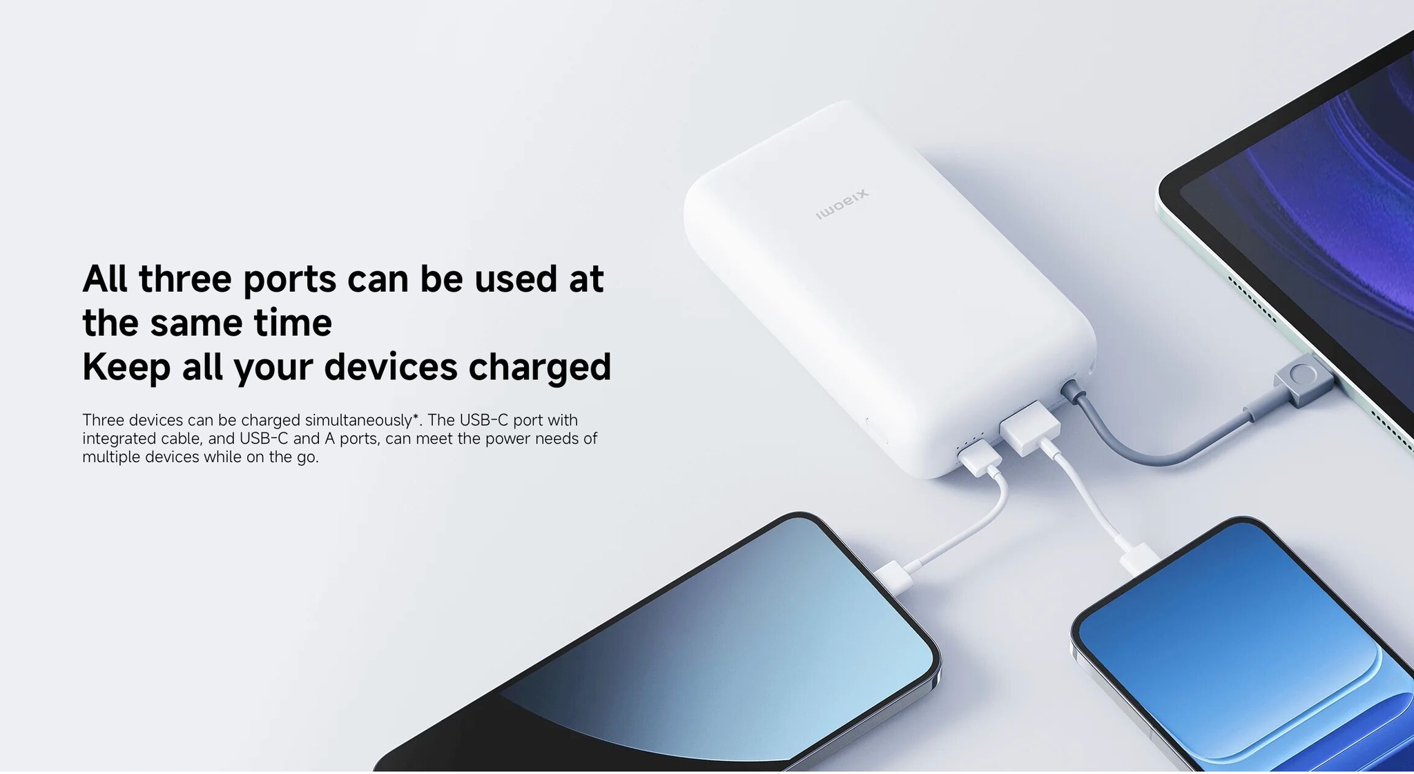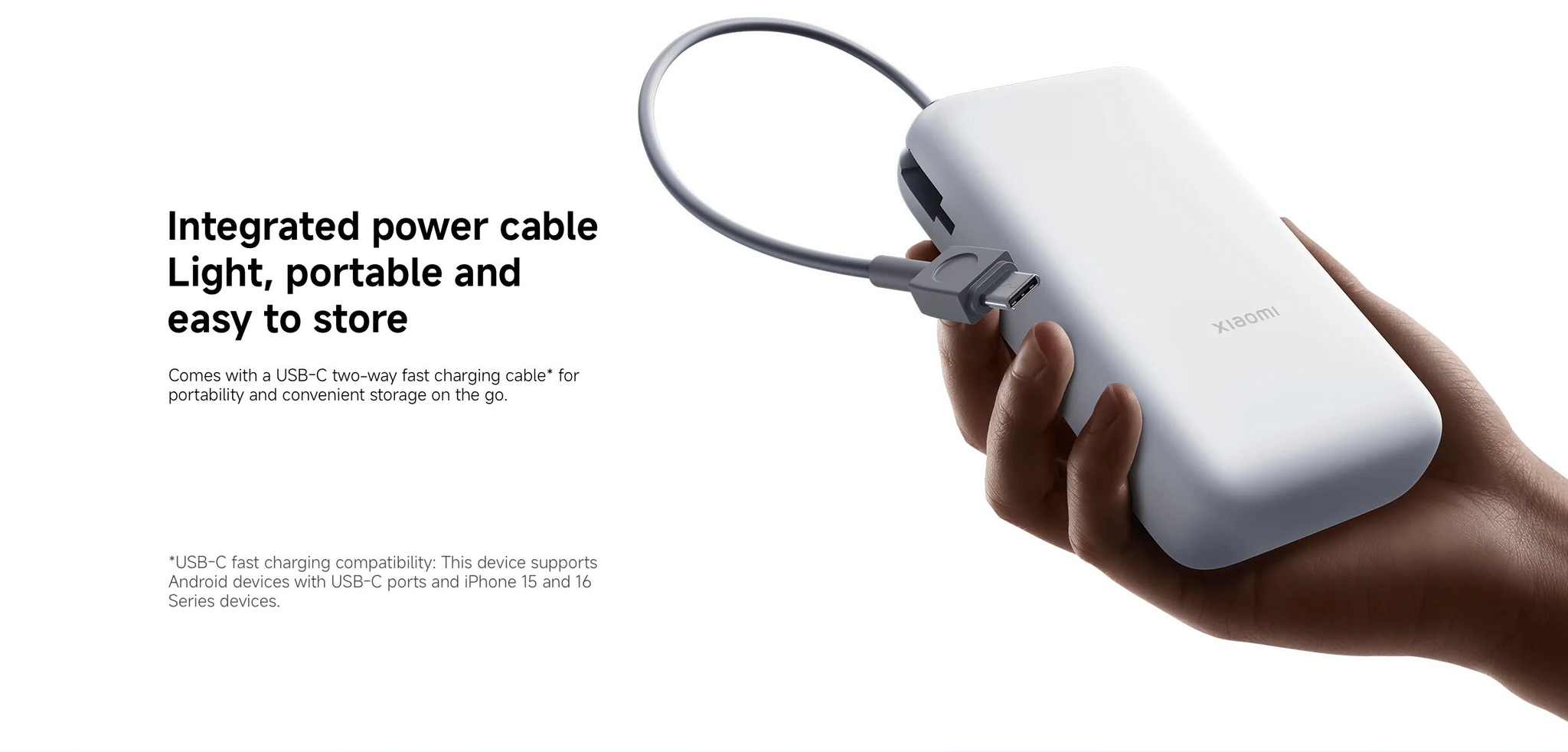 Le câble USB-C intégré permet de recharger l’appareil et simultanément des appareils compatibles, notamment les smartphones Android et les iPhone 15 et 16, sans accessoires supplémentaires.