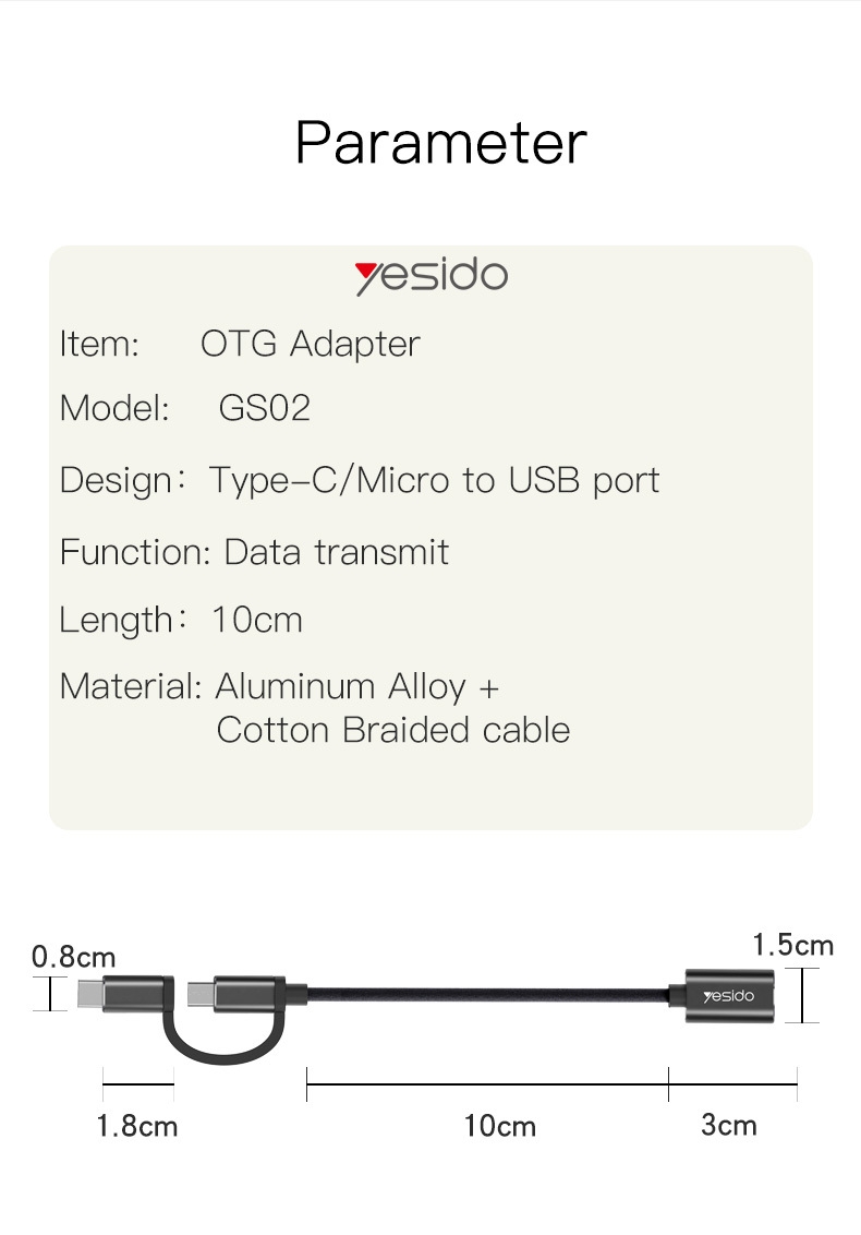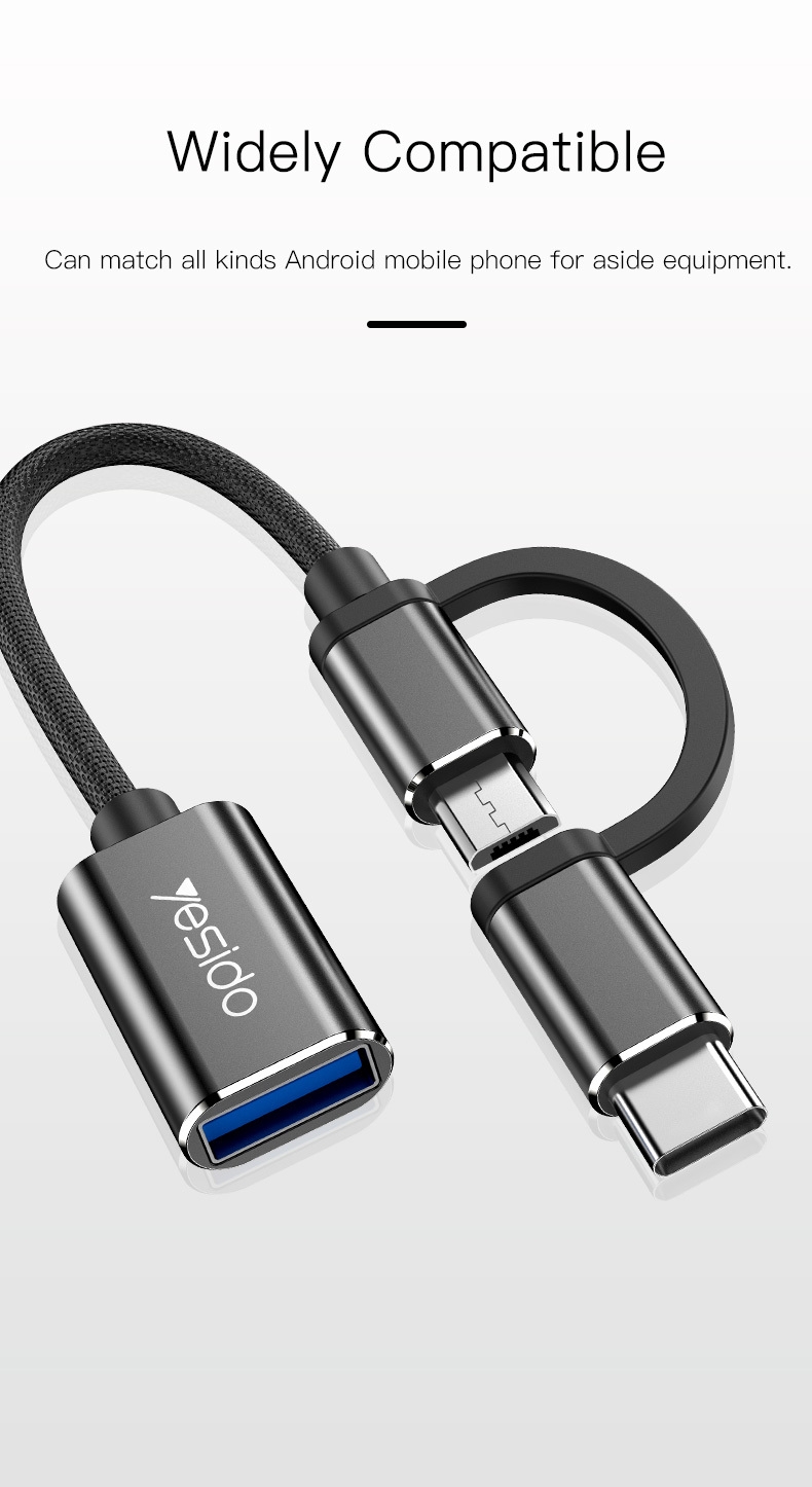 Fiche Technique Yesido Adaptateur OTG 2 en 1 Type-C / Micro vers USB – Câble Tressé Coton 10 cm Anti-Étirement, Transfert de Données et Charge Rapid