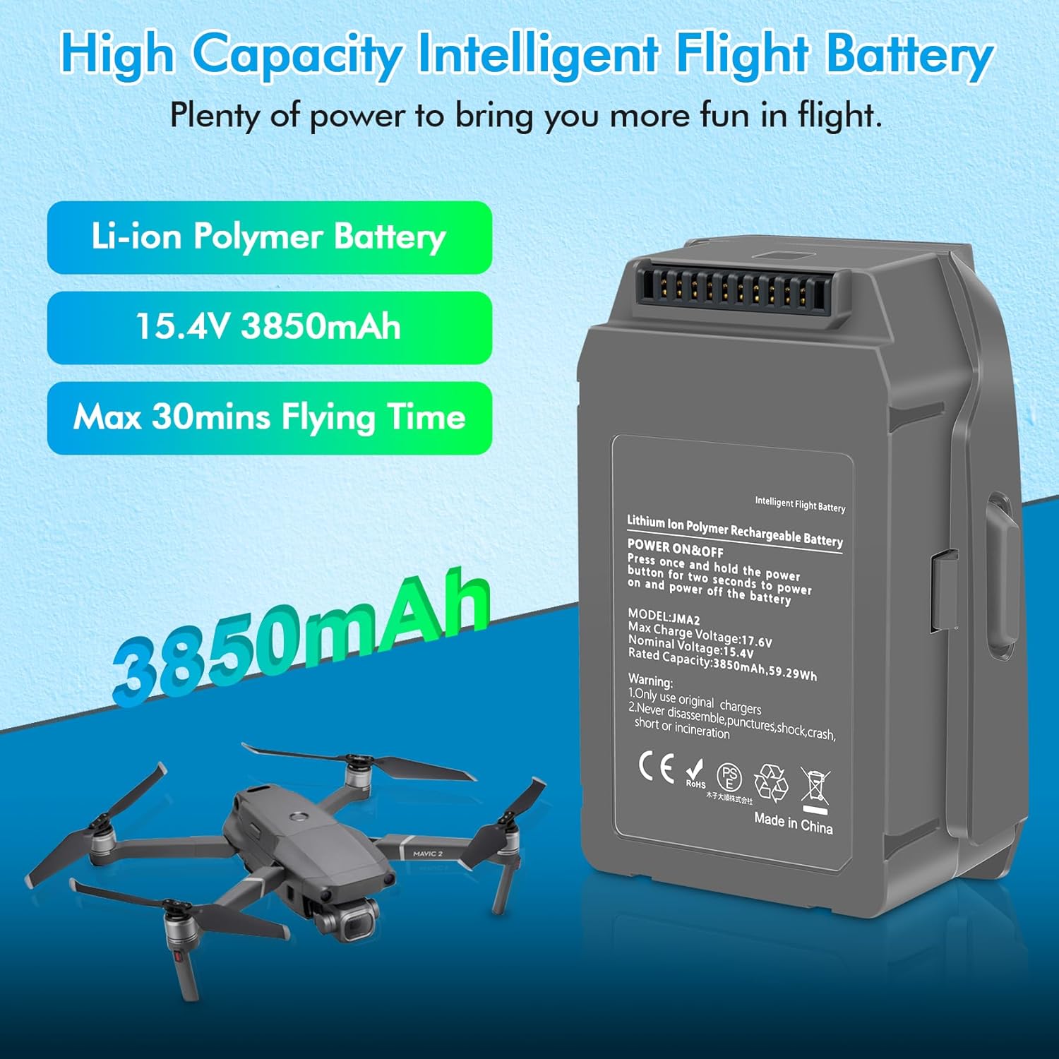Safety guarantee: the Coolshop mavic 2 pro battery is built with over-discharge protection, over-charge protection, excessive current protection, excessive temperature protection and short circuit protection. All Coolshop drone battery packs comply with RoHS, PSE and CE safety test standards. Leave your drone with your drone fly safely.