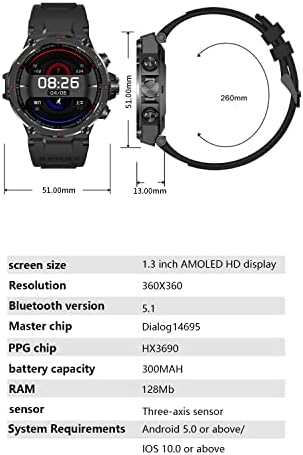 Smartwatch avec suivi GPS dans les sports de plein air et écran tactile HD AMOLED 1.3” / FONCTIONS: 14 modes sportifs: Course à pied, Course sur tapis roulant, Marche, Cyclisme en plein air, Cyclisme intérieur, Trailrunning, Tennis de table, Basket-ball, Football, Badminton, Cricket, Randonnée, Escaliers d’escalade, Freestyle. Surveillance de la fréquence cardiaque 24h. Compteur de pas, km et calories. Notifications d’APP et d’appels. Fonction pour raccrocher l’appel de la montre. Plusieurs conceptions d’écran dans l’APP et possibilité de télécharger une photo personnelle Surveillance du sommeil. Moniteur d’oxygène sanguin. Réveil et minuterie. Alarme sédentaire, pour boire de l’eau et des médicaments. Informations météorologiques. Télécommande pour prendre des photos. Contrôle du lecteur de musique de votre smartphone. Trouver mon téléphone-Trouver ma montre intelligente. Mode Ne pas déranger / CARACTÉRISTIQUES: Boîtier en alliage de zinc et bracelet en silicone. Longueur du bracelet: Total 260mm, réglable entre 150-190mm. Poids de la smartwatch: 46 gr. Résolution d’écran: 360×360. Batterie lithium polymère avec une capacité de 300mAh de longue durée: 7-10 jours en utilisation normale (14h avec l’utilisation du GPS) et 20-25 jours en veille (selon l’utilisation, la durée de vie de la batterie peut être inférieure). Temps de charge: 2.5h-3h. Charge magnétique: câble de charge inclus (prise USB non incluse. Utilisez des chargeurs USB 5V / 2A max.). Résistant à la chaleur et au froid et au niveau d’eau IP68*. Multi-langues: espagnol, anglais, Français, portugais, allemand, italien, japonais, russe, turc et polonais. / COMPATIBILITÉ: Compatible avec Strava, Google Fit et Apple Healt. Compatible avec les appareils iOS 10.0 ou supérieur et Android 6.0 ou supérieur. Application InfoWear / CONNECTIVITÉ: Bluetooth version 5.1 * IP68 -> submersible jusqu’à 1m pour un maximum de 30 min. en eau douce (ne pas utiliser en eau salée). Les dégâts d’eau sont hors du champ de la garantie car nous ne pouvons pas vérifier si l’étanchéité du produit a été altérée ou affectée par de petits chocs qui ont réduit sa résistance.