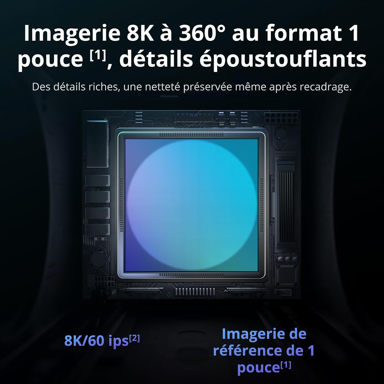 Imagerie 360° 8K au format 1 pouce – Grâce à des capteurs équivalents à 1 pouce[1], la lumière et les ombres sont capturées avec une clarté remarquable. La vidéo HDR 360° en 8K/60 ips offre une résolution suffisante pour obtenir des recadrages nets.