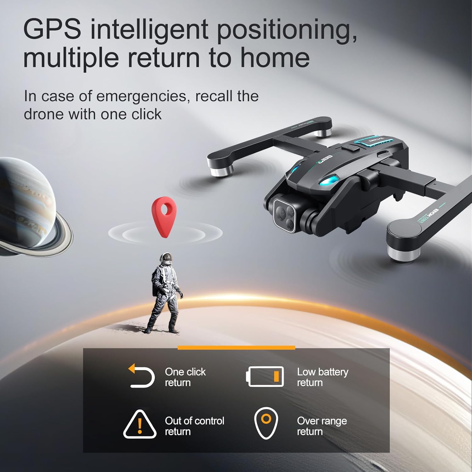 GPS ET POSITIONNEMENT FLUX OPTIQUE:Drone équipé de navigation et de positionnement GPS, positionnement précis, retour automatique,drone navigue automatiquement vers l’emplacement désigné .batterie faible ou un signal perdu, il peut revenir automatiquement au point de décollage, réduisant ainsi le risque de perte.Le système de positionnement du flux optique garantit que le drone peut planer avec précision, voler de manière plus stable et prendre des photos et des vidéos plus clairement.