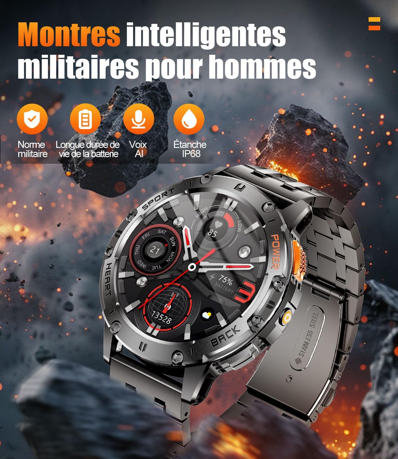 【Norme militaire & 5ATM Étanche】La montre connectée pour hommes ESFOE est fabriquée en métal de grade militaire, assurant durabilité et sensation premium. Elle a passé divers tests de grade militaire comme les températures extrêmes, basse pression, étanchéité et résistance à la poussière, la rendant adaptée aux conditions environnementales difficiles. Avec sa fonction super étanche 5ATM, elle est parfaite pour la natation et autres sports nautiques. Que ce soit pour un usage quotidien ou des activités aquatiques comme la natation et la plongée en apnée, cette montre robuste est prête à tout!