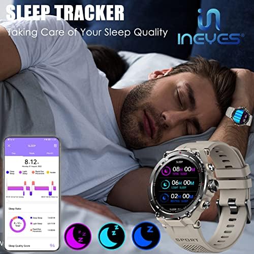 ⌚ 【MONITEUR DE FRÉQUENCE CARDIAQUE ET SUIVI DU SOMMEIL】 – La montre tactique fitness INEYES dispose d’une fonction de surveillance en temps réel qui collecte des votre fréquence cardiaque pendant 24 heures et la pression artérielle et l’oxygène sanguin en temps réel. La montre tracker d’Activité INEYES transmettra les données à l’application “Da Fit” pour mieux comprendre votre condition physique. Remarque : Cette fonction ne peut pas être utilisée comme tensiomètre médical professionnel.