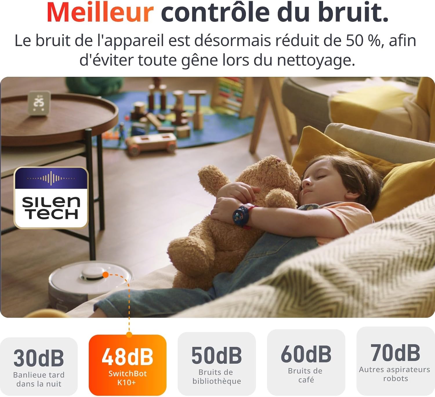 Moins de bruit : Après trois années de recherche, les ingénieurs de SwitchBot ont réduit le bruit émis par K10+ à moins de 50dB grâce à une conception optimisée du conduit d’aspiration, au couple du moteur et à SilenTech. Pour vous permettre de nettoyer tranquillement sans déranger vos voisins.