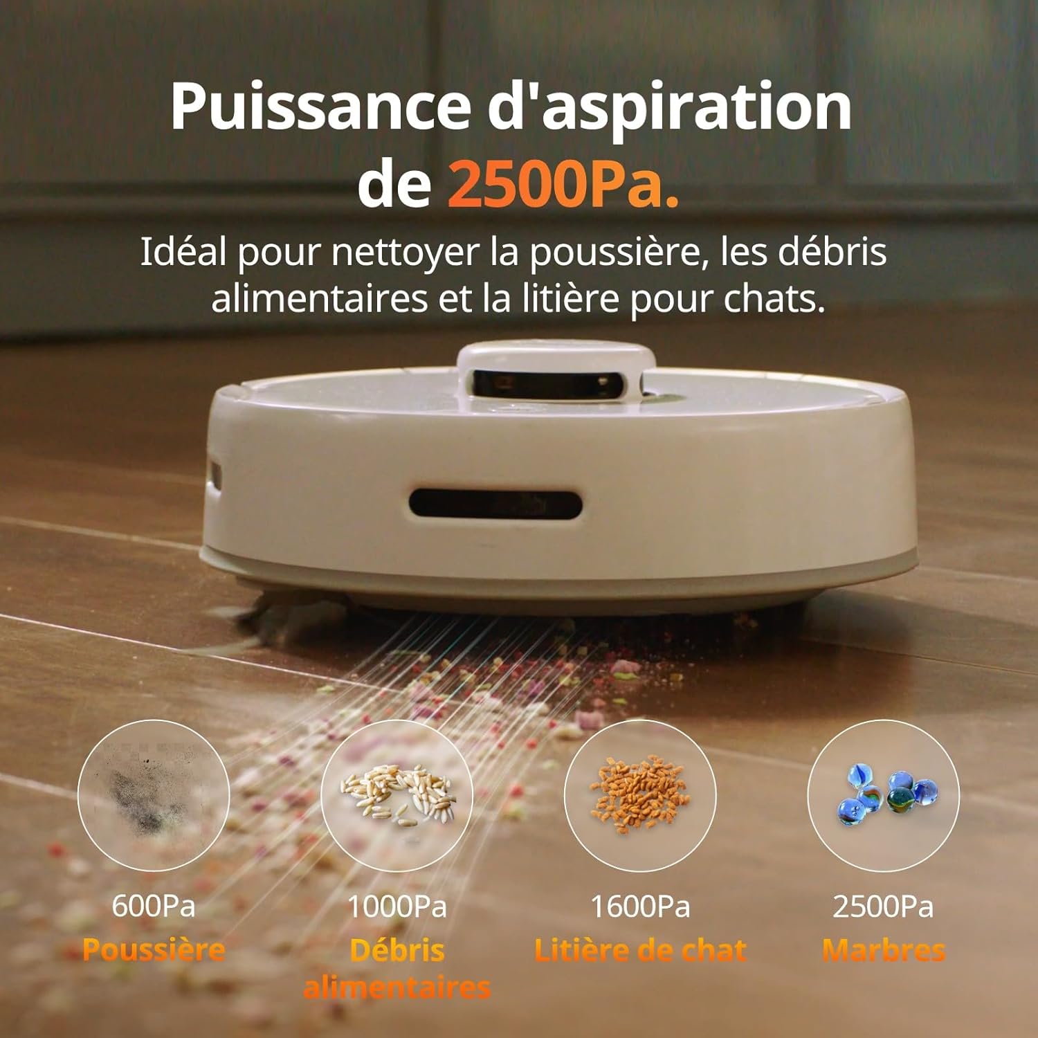 Un type d’aspirateur plus intelligent : K10+ est doté d’une fonction de recharge automatique pour les situations de batterie faible et reprend le nettoyage là où il s’est arrêté après une charge complète. Vous pouvez également personnaliser le nettoyage via notre application avec des plans, des zones restreintes et utiliser des commandes vocales (Alexa, Google Assistant) pour un nettoyage plus intelligent.