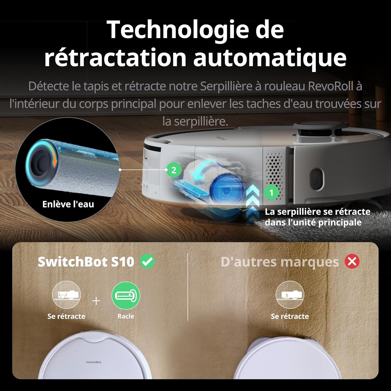 Fiche Technique SwitchBot S10 Aspirateur Robot Deux Stations, Remplissage et Vidange Automatique, RevoRoll Roller Mop, Levage et Auto-Lavage des Serpillières, Aspiration 6500 Pa, 10 Semaines Nettoyage Mains Libres au Maroc