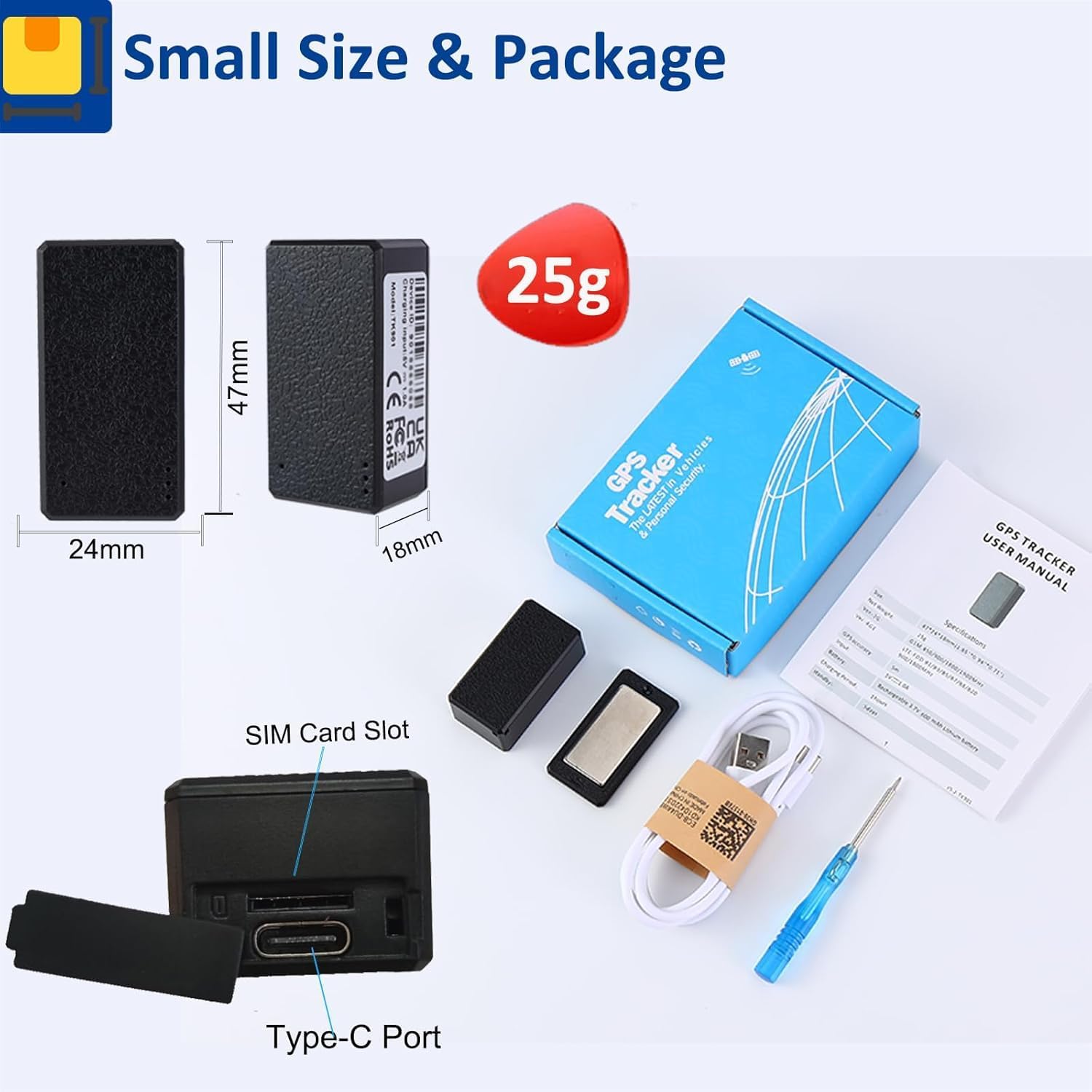 【Mini traceur GPS】 : taille du tracker GPS : 47 mm x 24 mm x 18 mm. Poids net : 25 g, une seule taille de pièce, mignon, parfait pour se cacher, petit et confiant.