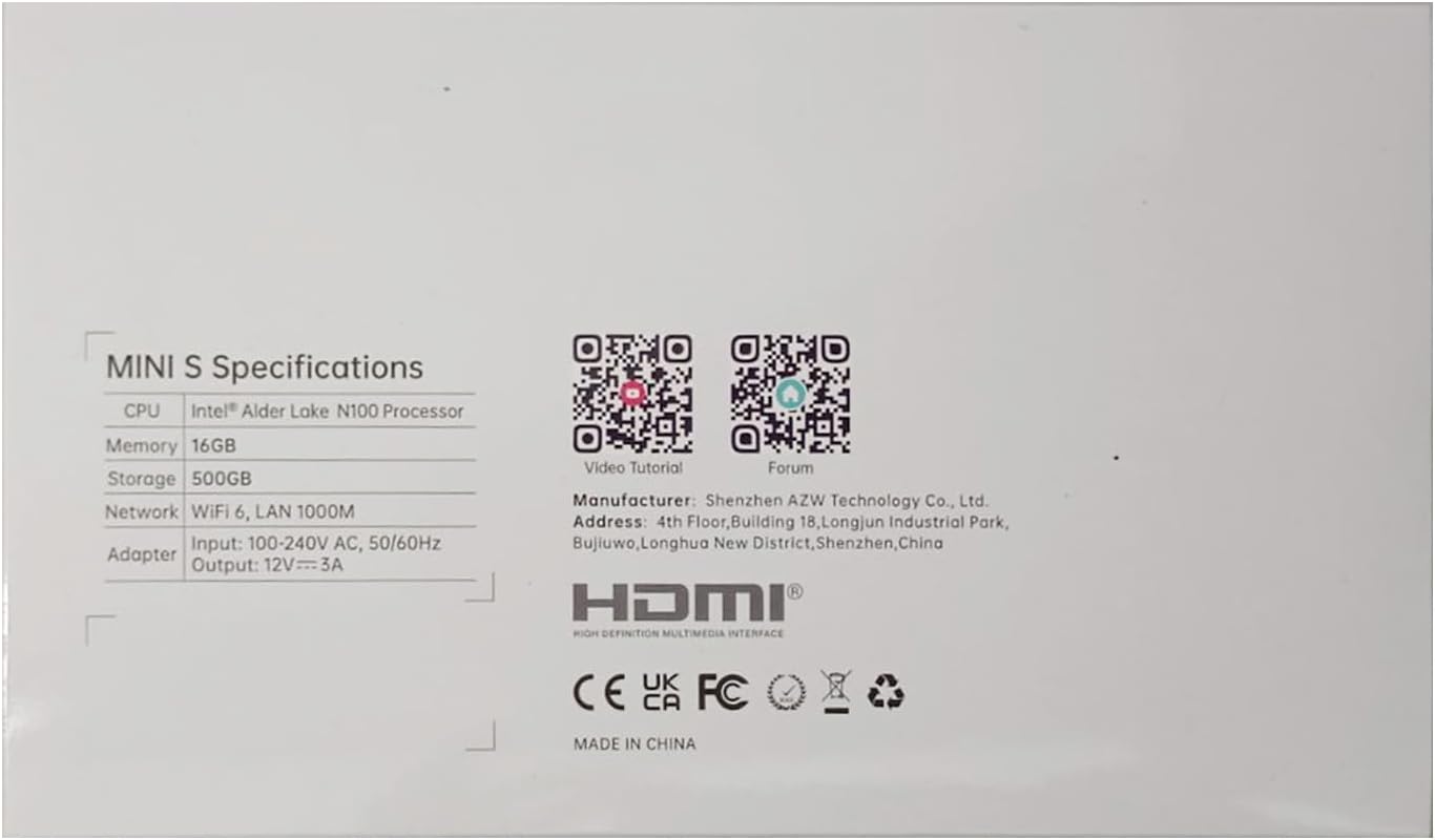 Processeur: Intel Alder Lake-N100 Processeur(4C/4T, jusqu’à 3,4 GHz) 6 Mo de cache intelligentCarte Graphique: Carte Graphique Intel UHD 750MHz (24EUs)Mémoire: 16 Go SO-DIMM DDR4 3200MHzROM: 500 Go M.2 2280 SSD (prend en charge M.2 2280 NVMe/SATA3 SSD, peut être configuré pour 2 TB de stockage). Vous pouvez également ajouter un disque dur 7 mm 2,5 pouces SATA HDD/SSD (2 TB maximum) pour étendre votre espace de stockage.Slots Internes: SO-DIMM DDR4 Slot*1, M.2 2280 SSD Slot*1, SATA HDD/SSD (2,5 pouces 7mm) Slot*1Interface: 5.5*2.5 DC Jack*1, USB3.2 Gen2 (10Gbps)*4, Realte 8111H 1000M*1, Prise téléphonique 3.5mm*1, HDMI (Max 4K 60Hz)*2, verrouillage*1Réseau: WiFi 6 (802.11ax), Bluetooth 5.2Adaptateur: Entrée 100-240V AC, 50/60Hz Sortie 12V 3ACaractéristiques Supplémentaires: WOL, AUTO POWER ONAccessoires: 1xManuel d’instructions, 1xSupport mural, 1xcâble HDMI 100CM, 1xcâble HDMI 25CM, 1xAdaptateur 12V/3A