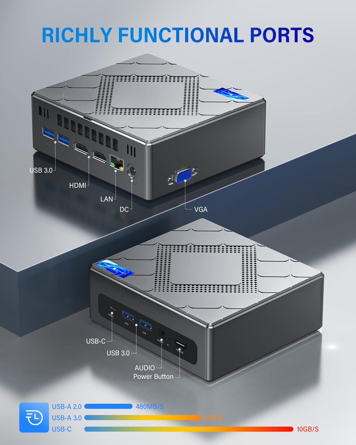 Interface Polyvalente Pour La Transmission Stable & Des Options Sans Fil : CK10 est équipé de 4 x USB 3.2 Gen1, 1 x USB C (transmission de données uniquement), 2 x HDMI, 1 x VGA, 1 x Gigabit LAN, 1 x entrée audio/microphone (3,5 mm) et 1 x prise DC. Vous pouvez connecter plusieurs appareils, comme moniteurs, souris, claviers. Ne vous inquiétez pas de température élevée grâce à une solution de refroidissement par ventilateur actif et à des évents sur le dessus pour réduire les températures.