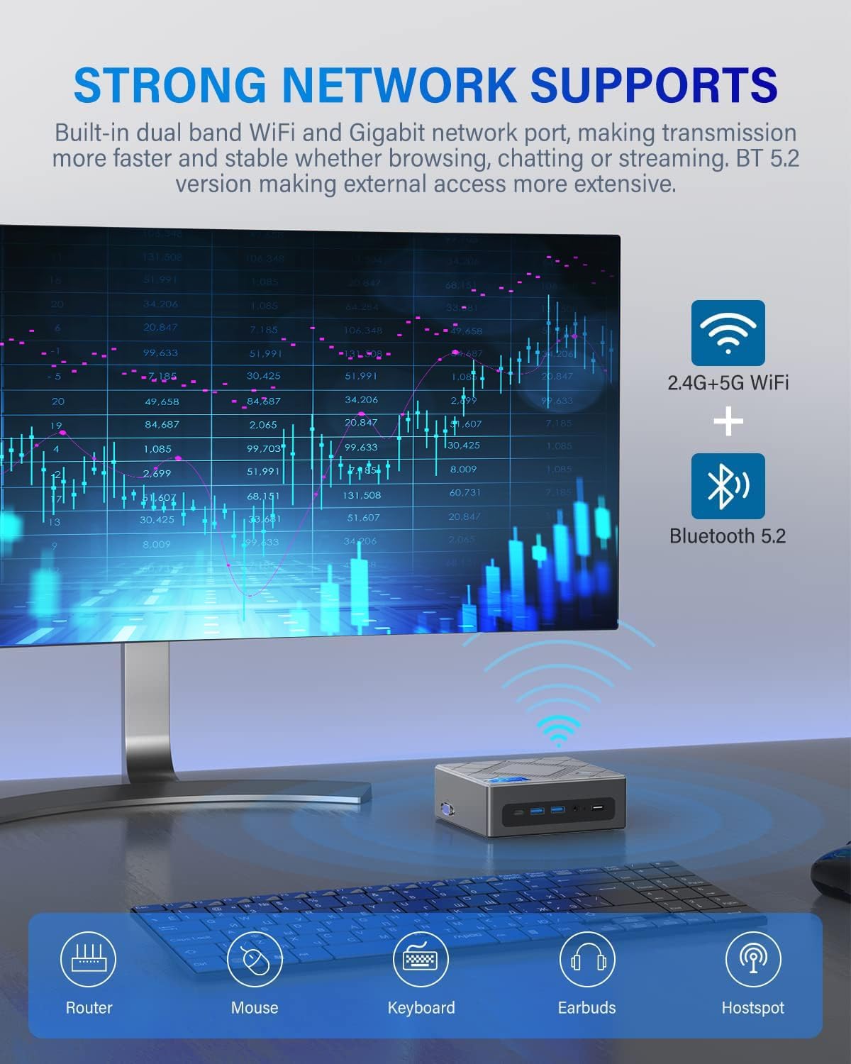 Gagnez De l’Espace: Le micni ordinateur est équipé des technologies WiFi6 et Bluetooth 5.2, ce qui permet d’établir facilement une connexion sans fil stable et de profiter davantage de votre travail et de votre vie. Le petit PC CK10 a un design compact, 13.7cm*12.6cm*5cm, et pèse seulement 540g (la taille de 2 téléphones portables), et peut être monté à l’arrière d’un moniteur ou d’une TV avec l’aide d’un support VESA !