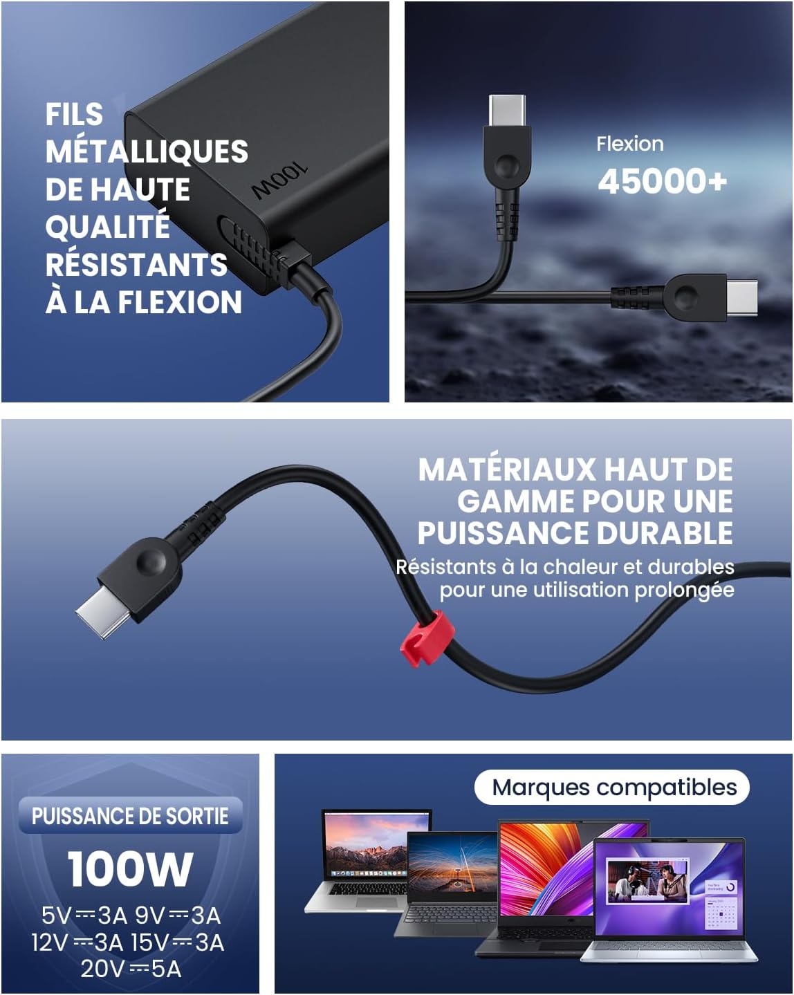 Fiche Technique 100W USB C Charger, Type C Power Supply for Yoga 9 9i 7 7i, Lenovo Legion Go, Yoga Slim 7 Pro/Prox, ThinkBook, ADL100YLC3A, ADL100YDC3A, SA11D52396 Portable Adapter au Maroc