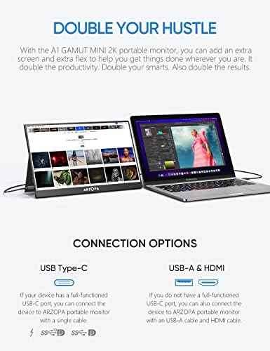 Fiche Technique ARZOPA Moniteur portable 2K, 13,3″ HDR pour ordinateur portable USB C HDMI Moniteur externe IPS Eye Care Écran externe pour PC Téléphone Mac Xbox PS5 Switch-A1 GAMUT MINI 2K