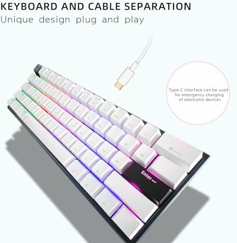 Avis sur Clavier de jeu mécanique portable 60 % rétroéclairé par LED, compact, 61 touches, mini clavier de bureau filaire avec interrupteur bleu, touches PBT pour ordinateur portable Windows, PC, Mac (blanc/noir)