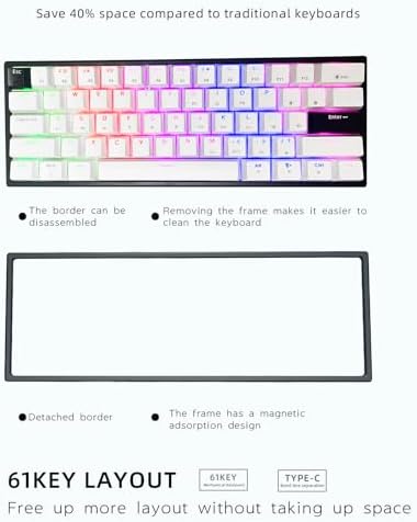 Fiche Technique Clavier de jeu mécanique portable 60 % rétroéclairé par LED, compact, 61 touches, mini clavier de bureau filaire avec interrupteur bleu, touches PBT pour ordinateur portable Windows, PC, Mac (blanc/noir)