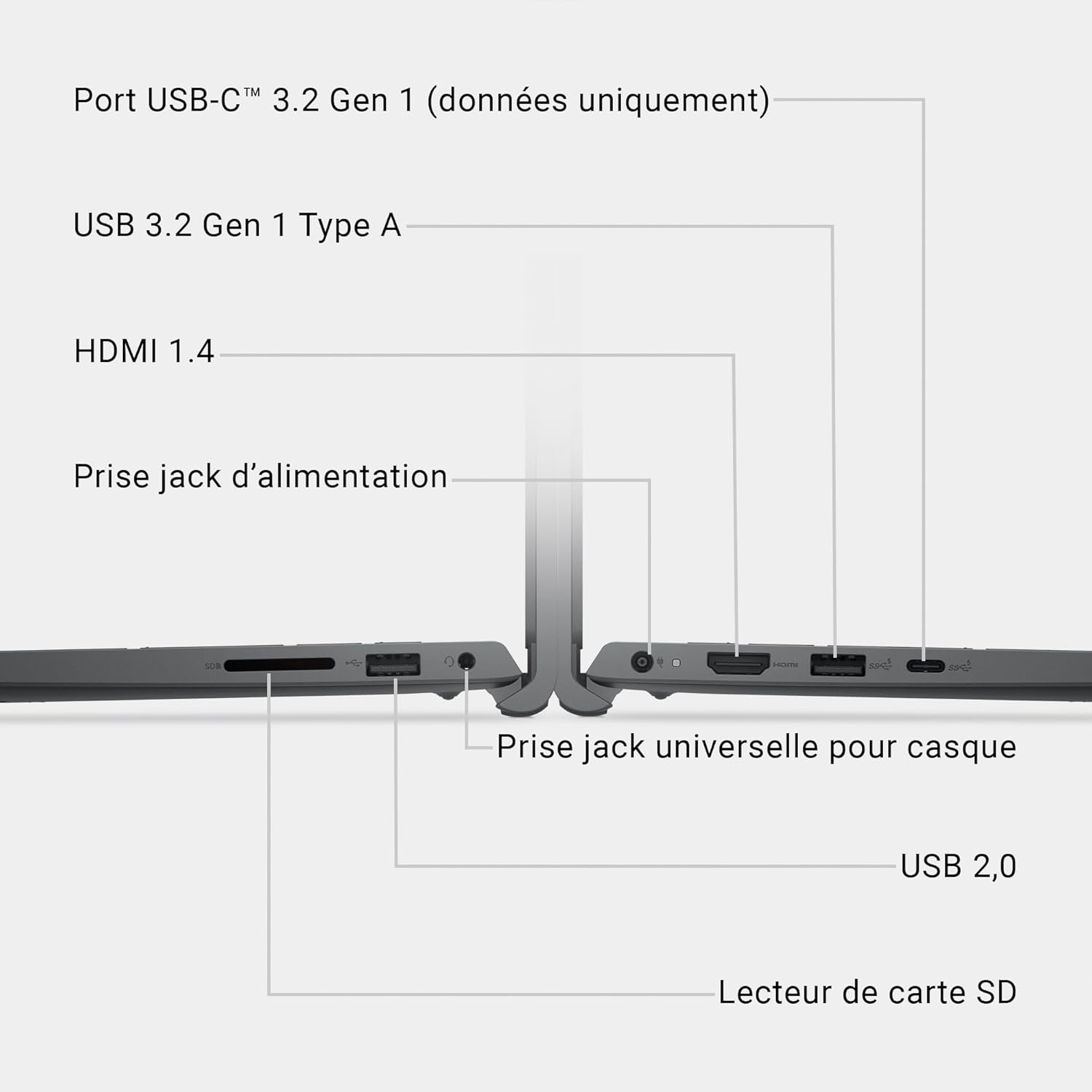 Designed for productivity, learning and everyday entertainment, the Dell 15 DC15255 combines the responsive performance of AMD Ryzen with efficient graphics and a modern display. Its 15.6″ FHD display delivers immersive clarity with a 120Hz refresh rate and thin edges, ideal for multitasking. The AMD Ryzen 5 7520U processor combined with Radeon 610M graphics provides reliable power for everyday tasks such as navigation, video conferencing, presentations, and lightweight content creation. With 8GB of LPDDR5 memory and a 512GB PCIe NVMe SSD, it ensures fast boots, smooth multitasking, and ample space for your files and software. Connectivity includes Wi-Fi 6, Bluetooth, HDMI, USB Type-C, USB 3.2 and microSD reader — ideal for connecting all your peripherals. Its professional carbon black design is complemented by a comfortable AZERTY backlit keyboard, perfect for working in a dark environment. With stereo speakers, HD audio, and Windows 11 Home, it’s ready to go home, school or on the go. Perfect for students, teleworkers or home users looking for a smooth, portable and high-performance laptop.