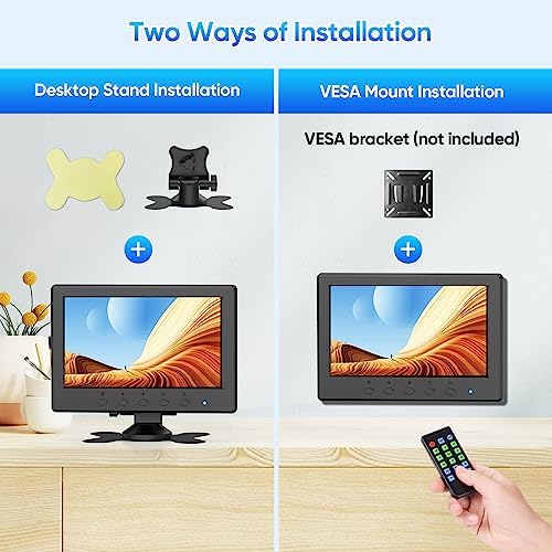 【Facile à installer et à contrôler】 : prend en charge deux méthodes d’installation : l’une consiste à utiliser le support d’installation sur bureau et l’autre est un montage mural à l’aide d’un support VESA de 75 mm (non inclus) à accrocher au mur, qui peut être utilisé comme un petit moniteur de télévision. Le produit comprend une télécommande, vous pouvez contrôler le moniteur à distance au lieu de simplement contrôler les boutons, ce qui est relativement pratique.