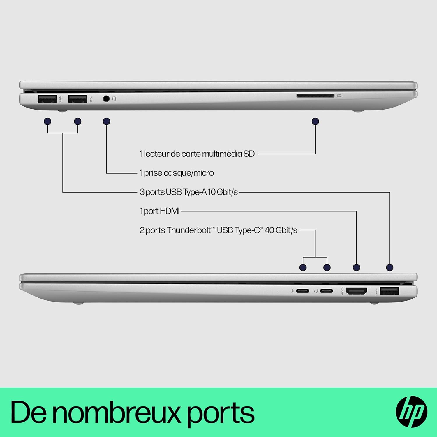 CONNECTIVITÉ : 2 ports Thunderbolt 4 Type-C (vitesse de transfert 40 Gb/s) + 1 port DisplayPort 1.4 + 3 ports USB Type-A + 1 port HDMI 2.1 + 1 prise combinée casque/microphone