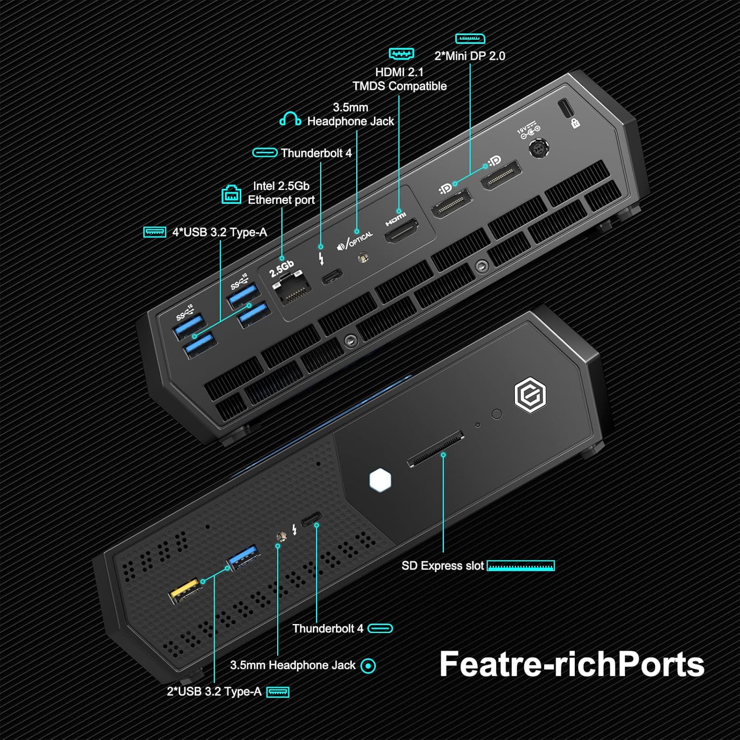 Un petit PC de jeu doté de nombreux ports : 2 ports Thunderbolt 4, 6 ports USB 3.2, 1 port HDMI 2.1, 2 ports DP2.0, 1 port Ethernet Intel i225-LM RJ45 2500 Mbps, 2 prises casque/mic 3,5 mm, 1 emplacement pour carte SDXC.