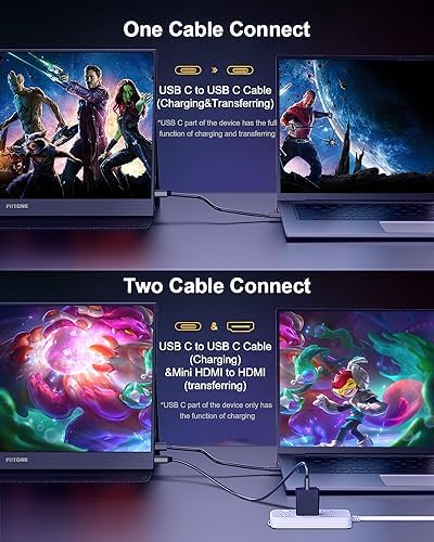 【Deux ports Type-C Plug & Play】Moniteur portable FitTONE pour ordinateur portable équipé de 2 ports Type-C complets et d’un port mini HDMI. Les fonctions d’alimentation et de transmission du signal vidéo HD peuvent être réalisées avec un seul câble USB Type-C (inclus). Accès facile à vos appareils préférés, compatible avec la plupart des ordinateurs portables, smartphones, PC, PS4, Xbox ou Switch, et plus encore (REMARQUE : non compatible avec iPhone ! Votre appareil doit prendre en charge Thunderbolt 3.0/4.0 ou USB 3.1 Type C DP ALT-MODE) .