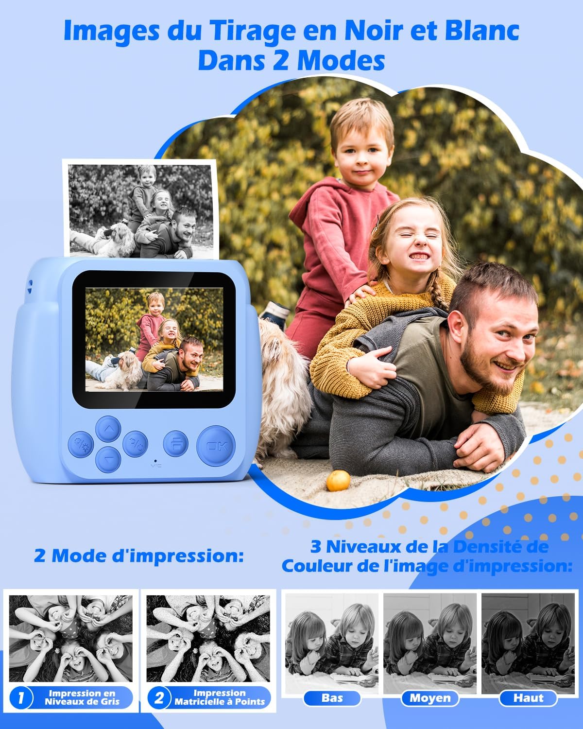 Appareil Photo Enfant Instantanée Il est doté d’un écran de 3 pouces, d’une résolution de 1080p et d’une carte mémoire de 32 Go.L’appareil photo pour enfants peut utiliser l’impression thermique pour imprimer des photos en noir et blanc.L’appareil photo pour enfants est livré avec des pinceaux colorés pour colorer les photos.