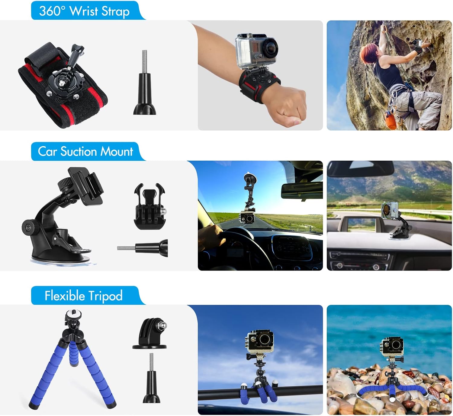 【Courroie de Poignet Pivotante à 360° + Pince Pivotante à 360°】La sangle de poignet maintient facilement votre caméra de sport sur votre poignet, le support de clip maintient votre caméra de sport stable sur la sangle de votre sac à dos et le design pivotant à 360° vous permet d’ajuster votre angle de prise de vue.