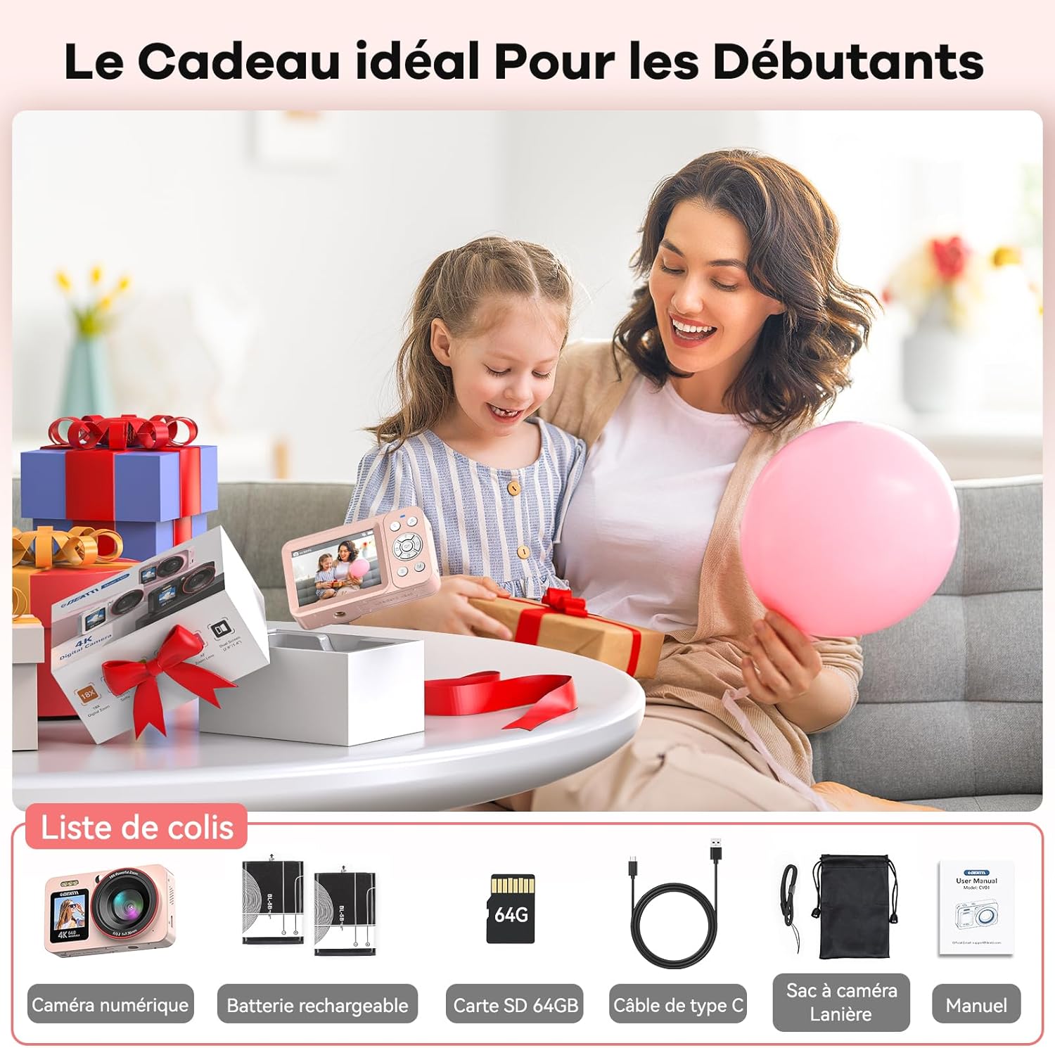 Fiche Technique DEATTI Appareil Photo Numérique 4K, FHD 64MP Appareil Photo Compact avec Double Écran, 18X Digital Camera Vlog pour Les Adolescents, Enfants, Les Adultes et Les Débutants, 64G Cart SD, Rose au Maroc