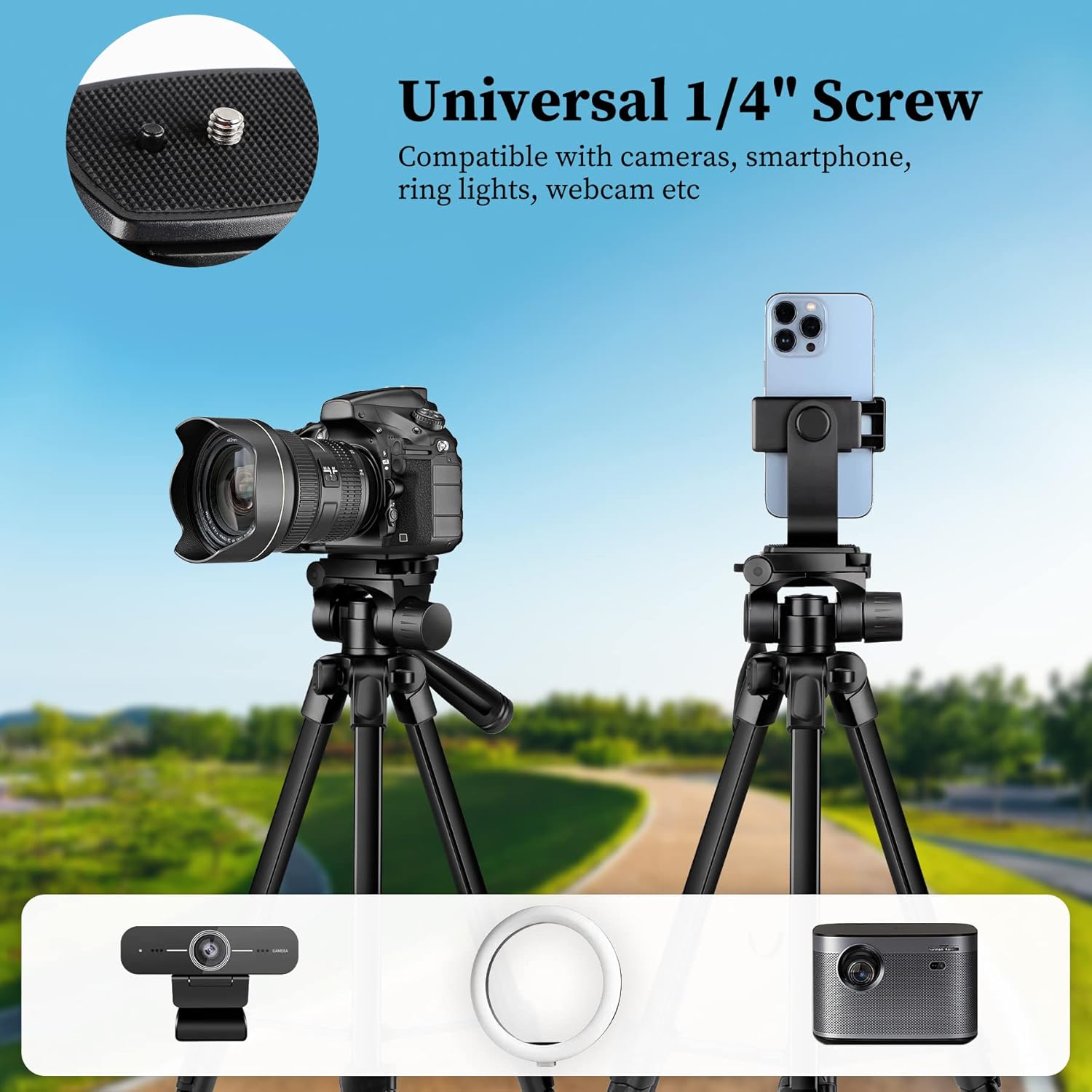 『Tripode pour la Plupart des Appareils Photo et Des Téléphones』Ce trépied est livré avec une plaque standard 1/4″ à libération rapide pour vous aider à installer rapidement l’appareil, y compris les petits appareils photo, les téléphones cellulaires, le petit projecteur, la webcam et les lumières annulaires