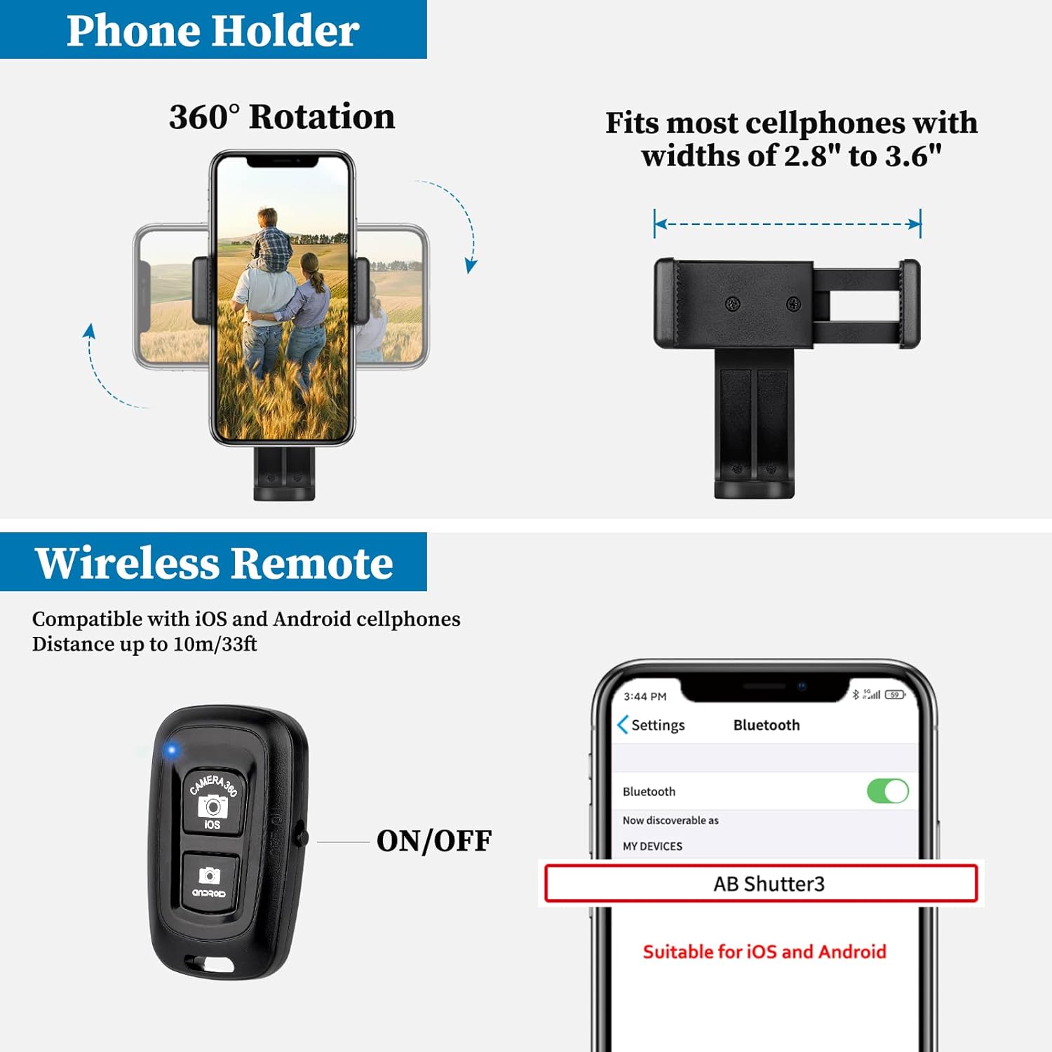 『Support Universel pour Téléphone & Télécommande Sans Fil』Le trépied pour iPhone fournit un support de téléphone universel rotatif à 360°, s’étendant de 2,6 à 3,6 pouces, qui convient à la plupart des smartphones. De plus, il est livré avec une télécommande sans fil pour les téléphones iOS et Android, compatible avec les iPhone 14/14 Pro/14 Pro Max/12 séries/13 séries/11 séries/XS séries/XR/X/8/8 Plus etc, et pour les téléphones Samsung/Huawei/Xiaomi séries etc