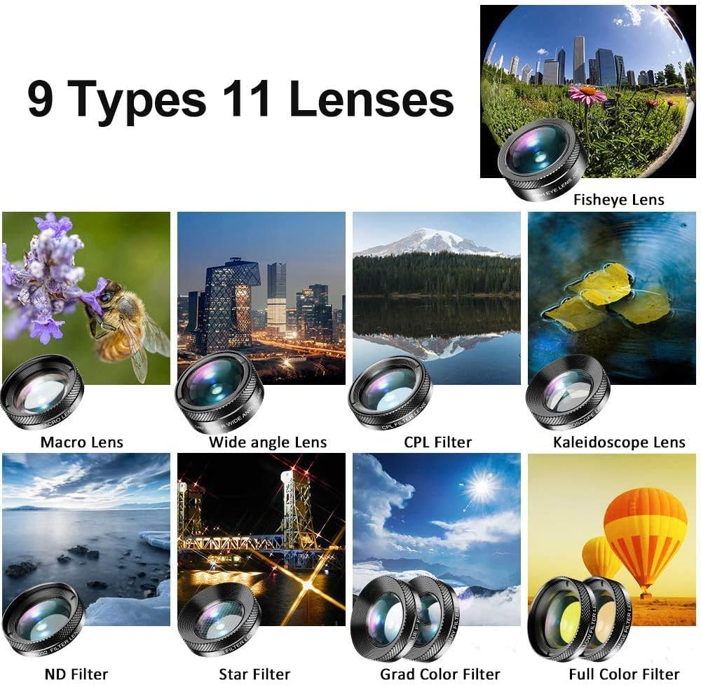 Le kit 11 en 1 comprend : ce kit parfait d’objectifs pour appareil photo de téléphone comprend un objectif macro, un objectif grand angle de 140 °, un filtre ND32, un objectif kaléidoscope, un filtre CPL, un filtre étoilé, un objectif fisheye 205°, 2 filtres de couleur gradués (bleu, gris), 2 filtres couleur (jaune, orange) pour votre photographie quotidienne et rend votre photographie plus créative.