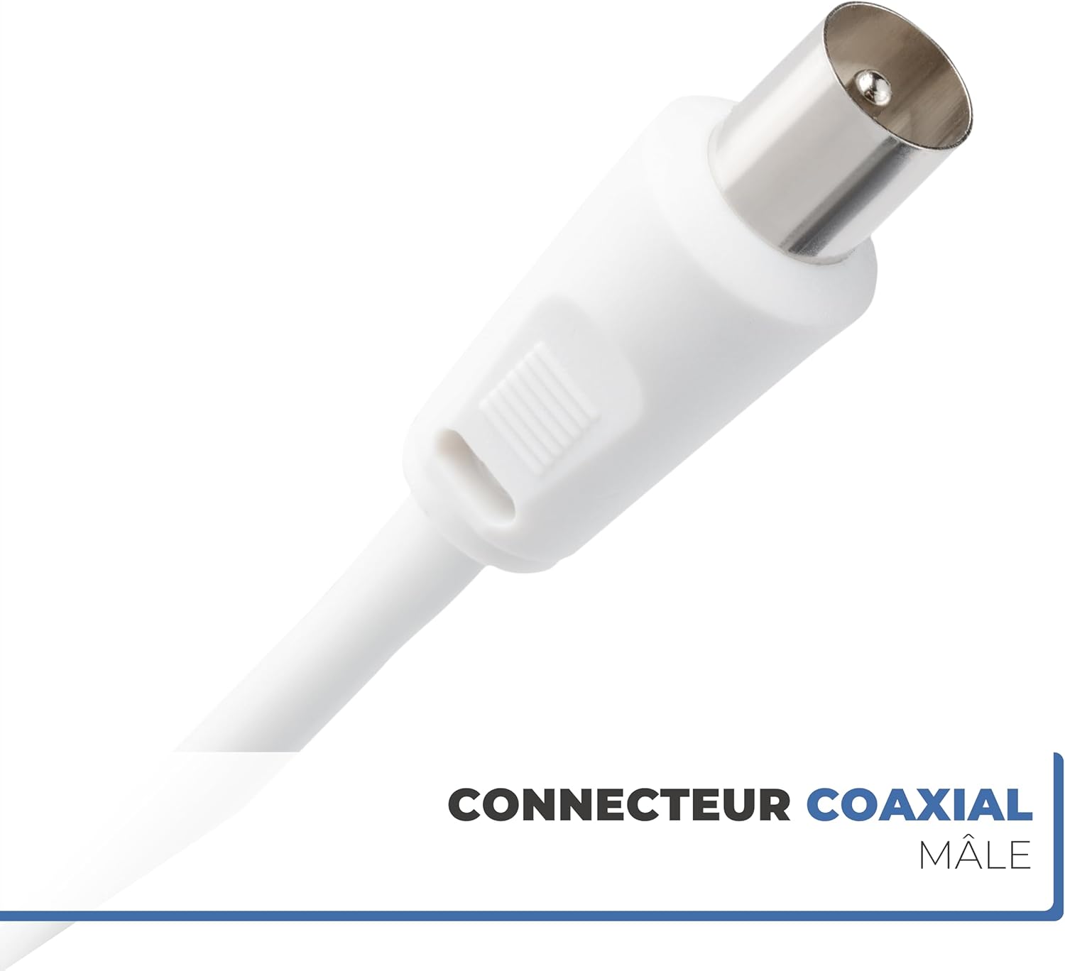 Meets new construction standards, this cable connects your TV to an RJ45 wall socket. – 1 RJ45 male connector – 1 TV plug 9.52 mm male – Length: 2 m – Colour: white