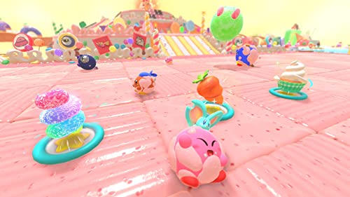Parcourez un assortiment de niveaux sur le thème de la nourriture en 4 tours amusants à 4 joueurs dans la peau de Kirby… qui semble plus rond que d’habitude ? Parcourez de délicieux parcours d’obstacles pour récolter des fraises à mesure que Kirby grandit. Ensuite, inversez la tendance lors du tour final : un combat fruité au sommet d’une plate-forme flottante.