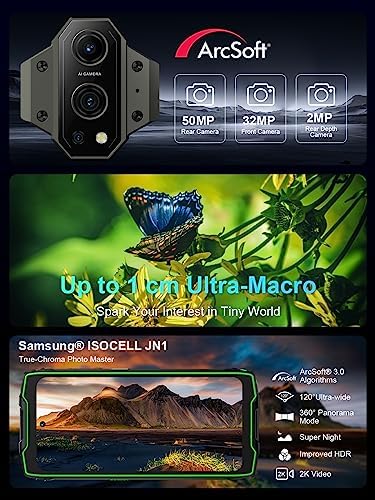 【Caméra arrière ArcSoft 3.0 + 50MP + caméra avant 32MP】Téléphone Blackview BV9300 doté de la caméra frontale Samsung ISOCELL GD2 de 32MP qui peut fournir des photos plus lumineuses dans des conditions de faible luminosité et des photos plus façonnées à la lumière du jour, la caméra arrière principale Samsung ISOCELL JN1 de 50MP avec 30% de mises à niveau en termes de fidélité des couleurs de l’image, caméra arrière de 8 MP comprenant un objectif ultra-large de 120 ° et la capacité de capturer des photos ultra-macro aussi proches que 1 cm, caméra de profondeur arrière de 2 MP et conçue avec la technologie ArcSoft 3.0 pour améliorer les photos avec un aspect professionnel Effets.Et le BV9300 prend en charge la capture panoramique à 360 °, le mode super nuit, le HDR amélioré, le mode portrait, la lumière de remplissage du visage, le mode beauté.