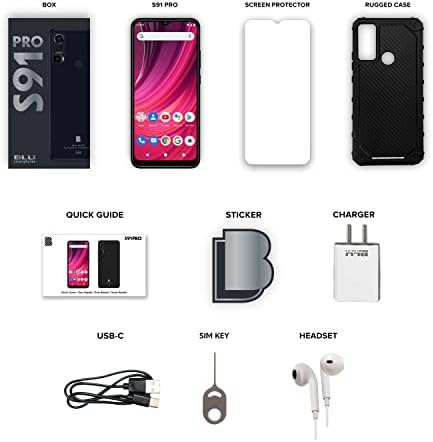 Contenu de la boîte : S91 Pro, protecteur d’écran, étui robuste, guide rapide, autocollant, chargeur, câble USB-C, clé SIM