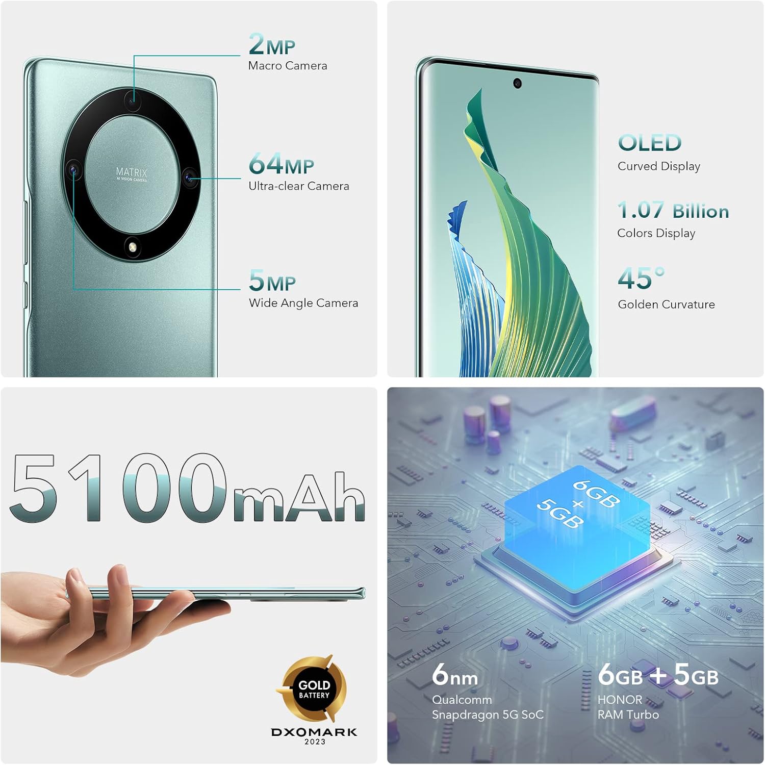 【8 Go + 256 Go – HONOR RAM Turbo】Équipé de puissants processeurs Qualcomm Snapdragon,smartphone HONOR Magic5 lite 2023 étend intelligemment 8 Go de RAM avec 5 Go avec la technologie HONOR RAM Turbo, profitez de performances fluides et de temps de réponse ultra-rapides, même lorsque vous courez. plusieurs applications simultanément.