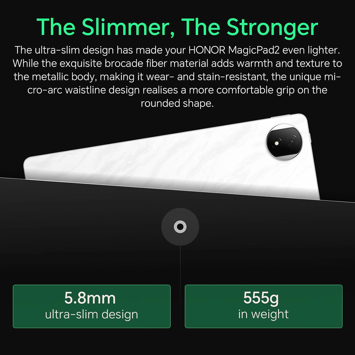 【Stylish, Durable & Lightweight Design】With a slim profile of 5.8mm and a weight of only 555g, the HONOR MagicPad2 is not only portable but also powerful. The device features an aircraft-grade feather fiber back cover for greater durability